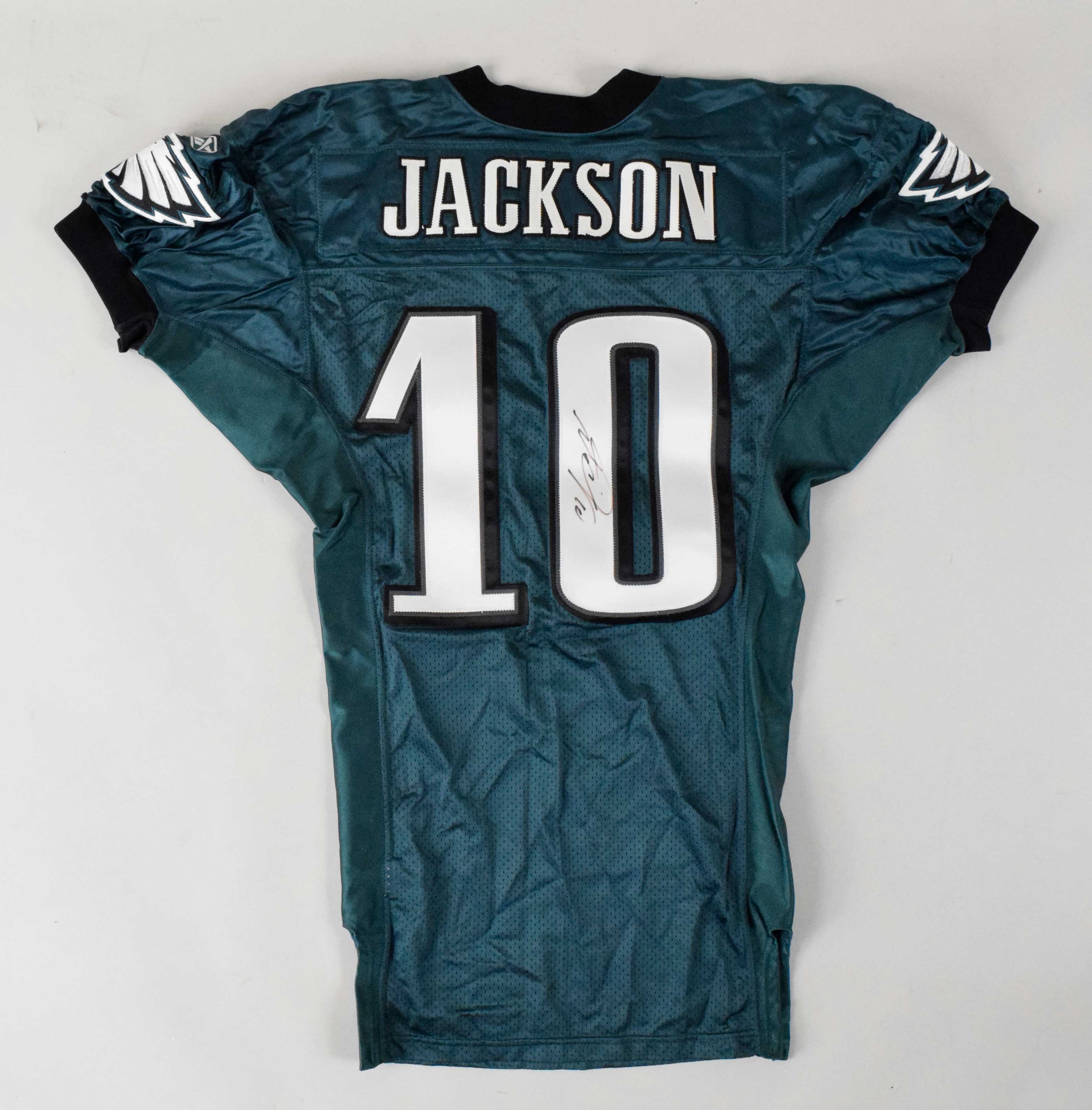 Description:2011 DeSean Jackson autographed Philadelphia Eagles professional model jersey (EX/MT). Green knit and mesh jersey has original #10 on front, back and both shoulders. "11-44 S" tagging is inside the collar with Reebok tags on the tail. "Jackson" nameplate remains affixed to the reverse, and Jackson signed the back number in black marker, rating 7 out of 10. PSA/DNA serial #N74542 sticker is affixed to the inside collar on the jersey, authenticating the autograph only. Little, if any, evidence of use is apparent: EX/MT.