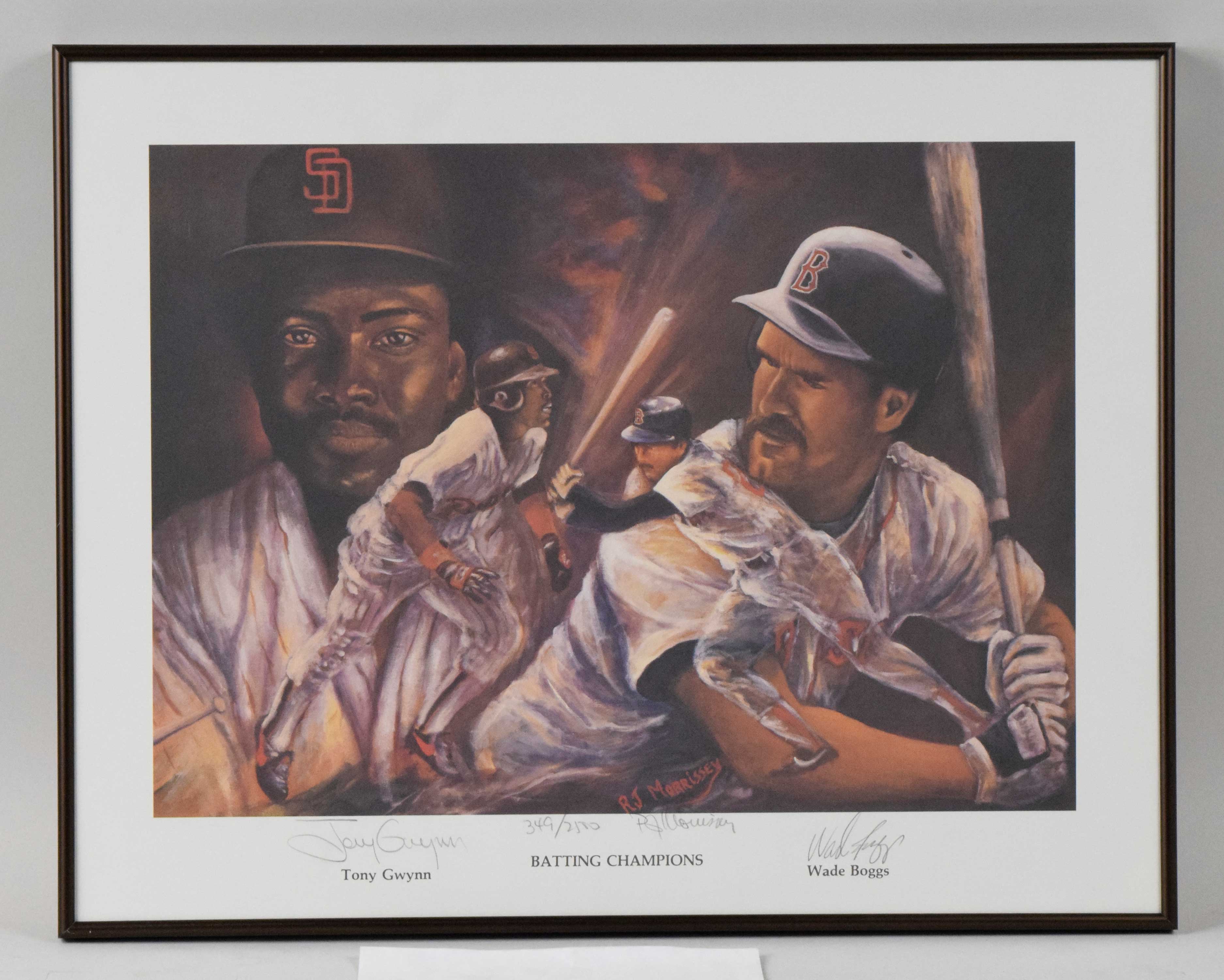 Description:Tony Gwynn and Wade Boggs autographed limited edition print (NM). Framed (19.25"x24") print is signed by both in pencil rating 9 out of 10. Also signed by the artist and numbered out of (2500) pieces: NM.