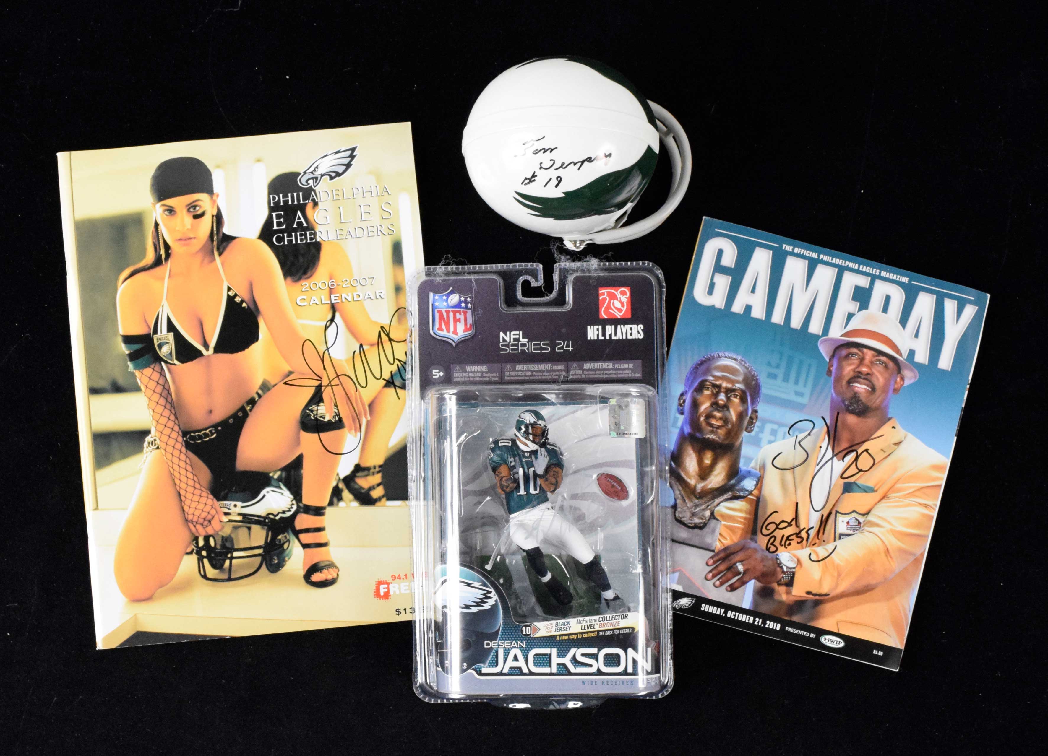 Description:Lot of (4) Philadelphia Eagles autographed items with Brian Dawkins program, Tom Dempsey mini-helmet (Sigs. NM-MT). Assortment of Eagles signed items includes (1) 2018 Eagles Gameday program signed by Brian Dawkins with "God Bless" inscription; (1) 2006-2007 Eagles Cheerleaders Calendar autographed by (38) cheerleaders on the front and back covers and interior pages; (1) McFarlane DeSean Jackson figure (new in packaging) autographed on the front by Jackson and (1) Riddell Eagles throwback mini helmet signed by Tom Dempsey. Signatures range from 7 to 9 (avg. 8/9) out of 10, and items range EX-NM/MT.