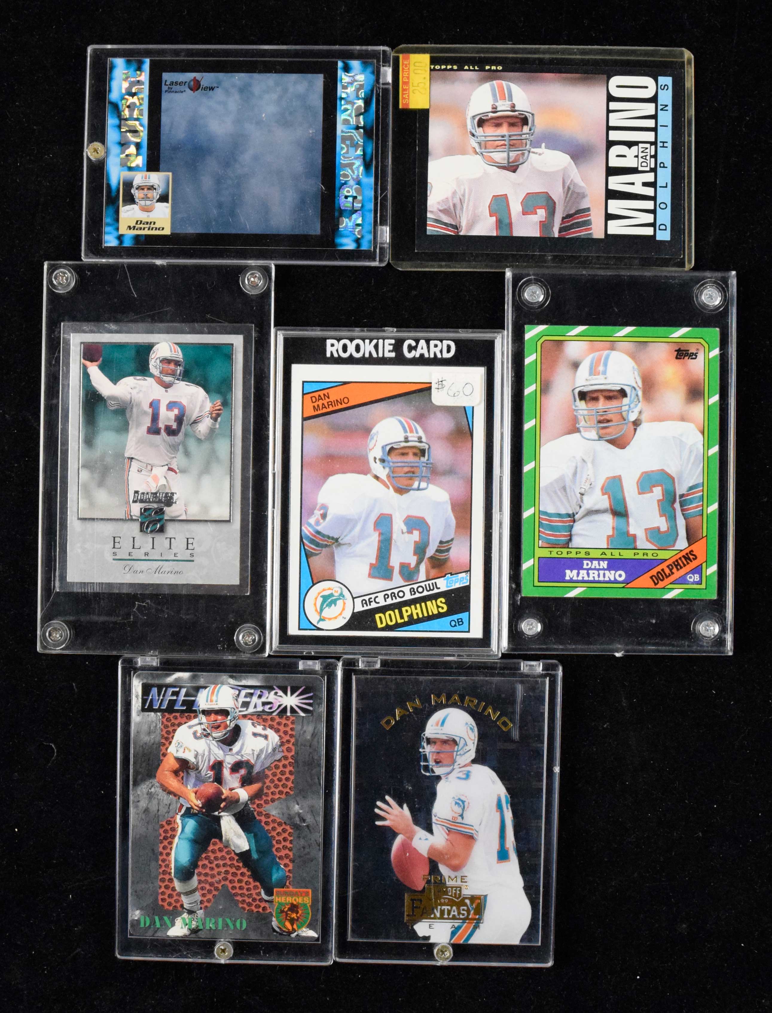 Description:Shoebox of (150+) 1980s-1990s Dan Marino cards, including 1984 RC (EX-MT). Most are in thick screwdown holders or top loaders, and includes some team sets and other players. Includes and assortment of 1980s & 1990s cards with some inserts and (1) 1984 #123 rookie card (EX). Most cards appear NM-NM/MT or better. Range: EX-MT.