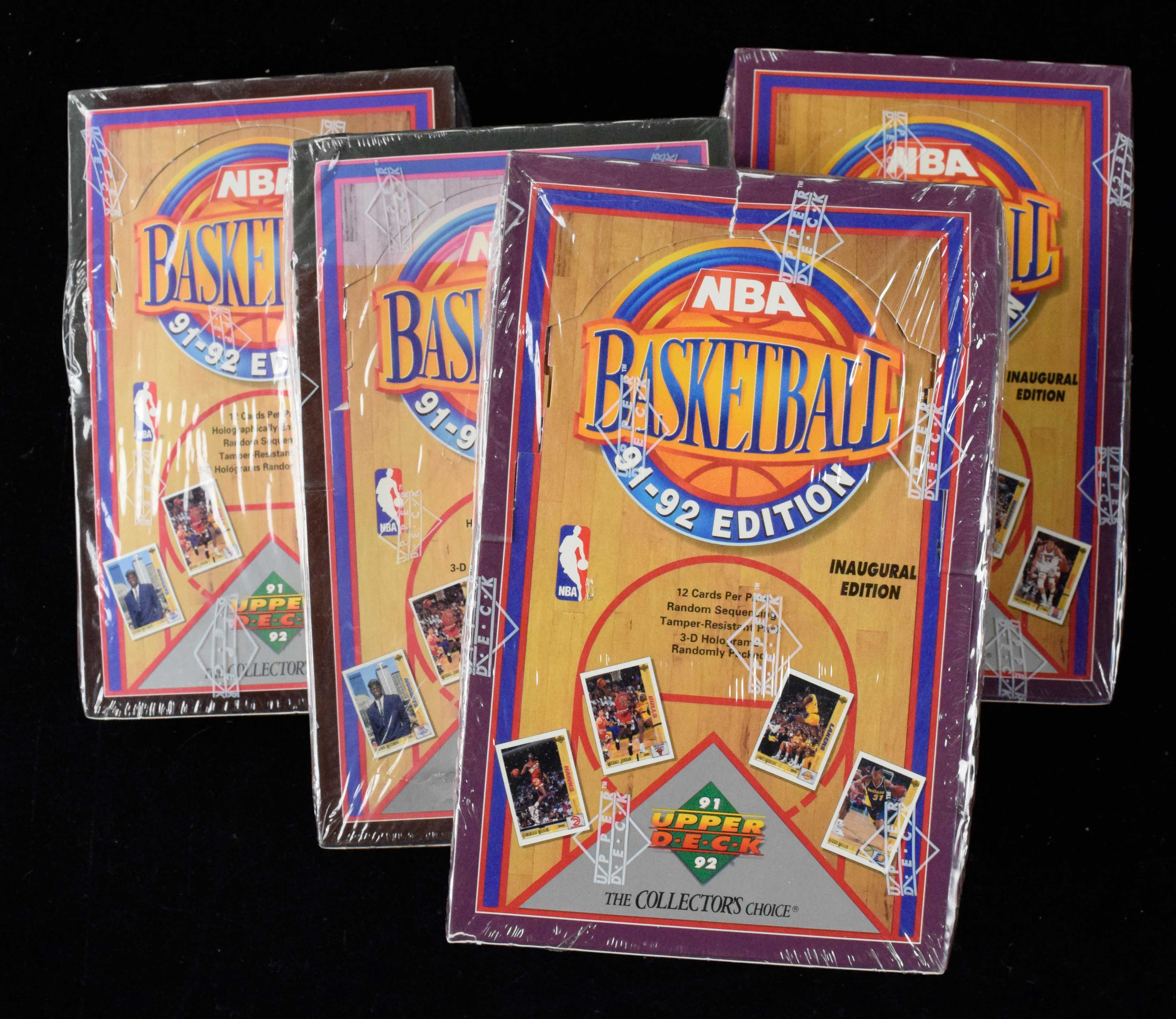 Description:Lot of (4) 1991-92 Upper Deck NBA factory-sealed high and low series hobby boxes (NM/MT). Nice lot of original unopened material, with (2) Inaugural Edition Low Series boxes and (2) Inaugural Edition High Series (Find the West) box. Each contains (36) unopened packs. Boxes have very light shelf wear and remain in their original factory-sealed condition: NM/MT.