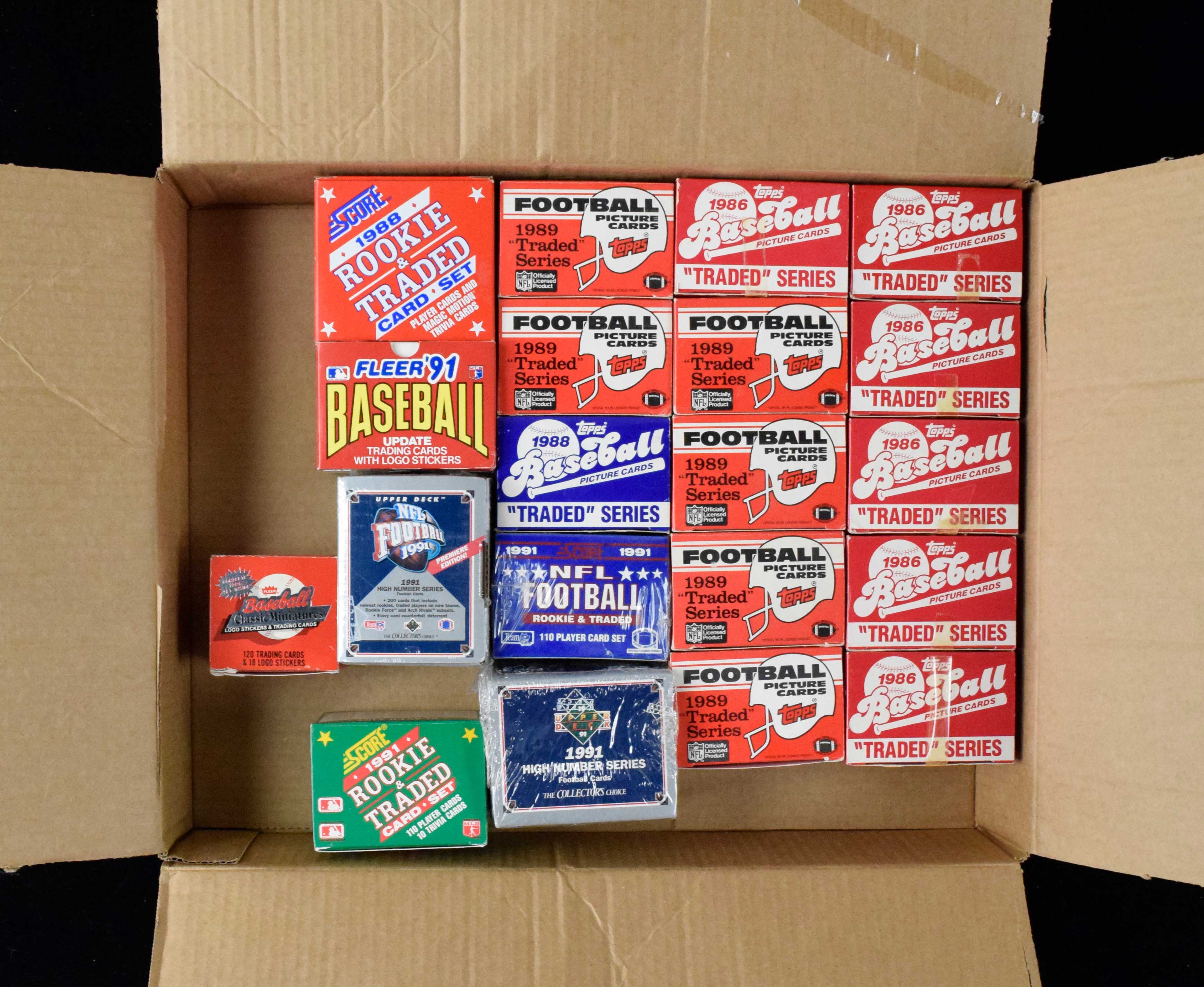 Description:Multi-sport lot of (20) 1980s-1990s Traded and Update sets, including (6) 1986 baseball, (6) 1989 Football (VG/EX-NM). Lot of small Traded and Update sets includes football and baseball, all in original boxes and some with original tape or factory seals. Includes (6) 1986 Topps Traded baseball sets (all sealed with original factory tape); (6) 1989 Topps Traded football sets; (1) 1988 Topps Traded baseball set; (2) 1991 Upper Deck football Hi Series sets (both factory sealed); (1) 1988 Score baseball Rookie & Traded set; (1) 1991 Score baseball Rookie & Traded set; (1) 1991 Score football Rookie & Traded set (factory sealed); (1) 1986 Fleer Baseball Miniatures and (1) 1991 Fleer Update baseball set (rubber band residue on top). Boxes have light to moderate shelf wear: VG/EX-NM.