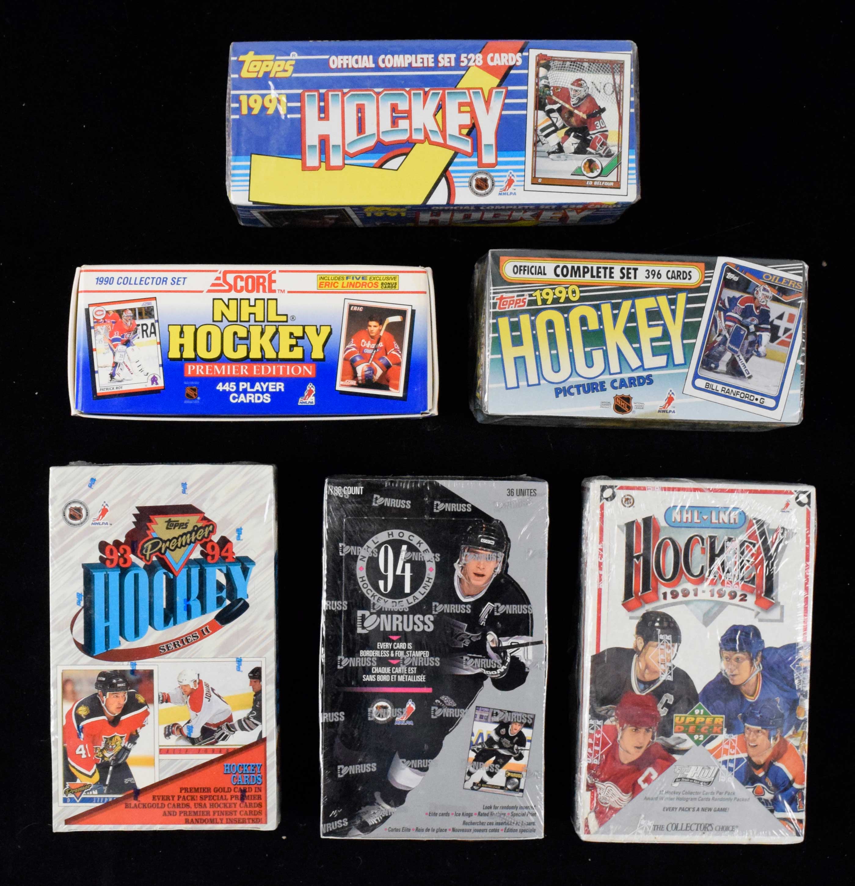Description:Lot of (6) 1990s NHL hobby boxes and factory sets, with most sealed (EX/MT-NM/MT). Lot includes (1) 1991-92 Upper Deck hobby box; (1) 1993-94 Topps Series 2 hobby box; (1) 1994 Donruss hobby box; (1) 1990 Score factory set (not sealed); (1) 1990 Topps factory-sealed set and (1) 1991 Topps factorys-sealed set. Boxes/sets range EX/MT-NM/MT.