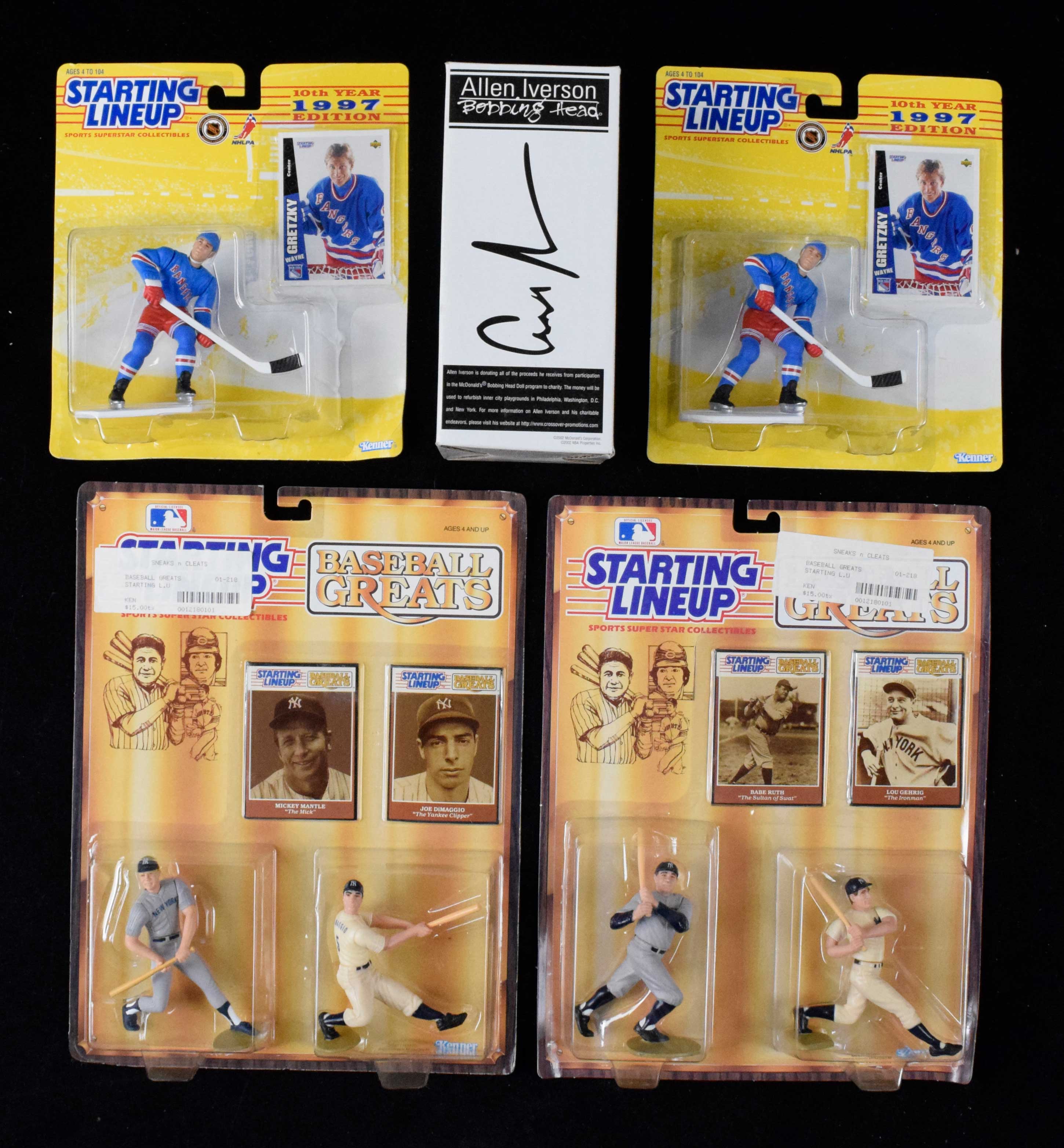 Description:Lot of (32) Starting Lineup figurines and more, including (14) Gretzky, (9) Mantle/DiMaggio (EX-NM). All remain in original packaging, new in box or sealed/on card. Includes (14) 1997 Starting Lineup Wayne Gretzky; (9) 1989 Starting Lineup Baseball Greats Mickey Mantle and Joe DiMaggio; (2) 1989 Starting Lineup Baseball Greats Willie McCovey and Willie Mays; (1) 1989 Starting Lineup Baseball Greats Babe Ruth and Lou Gehrig; (1) 1989 Starting Lineup Baseball Greats Reggie Jackson and Don Drysdale; (1) 1997 Galoob L.A. Lakers All-Star MVPs and (4) 2002 Allen Iverson stadium giveaway bobbleheads in original boxes. Boxes have mostly light to moderate wear: EX-EX/MT. Figures appear NM or better.