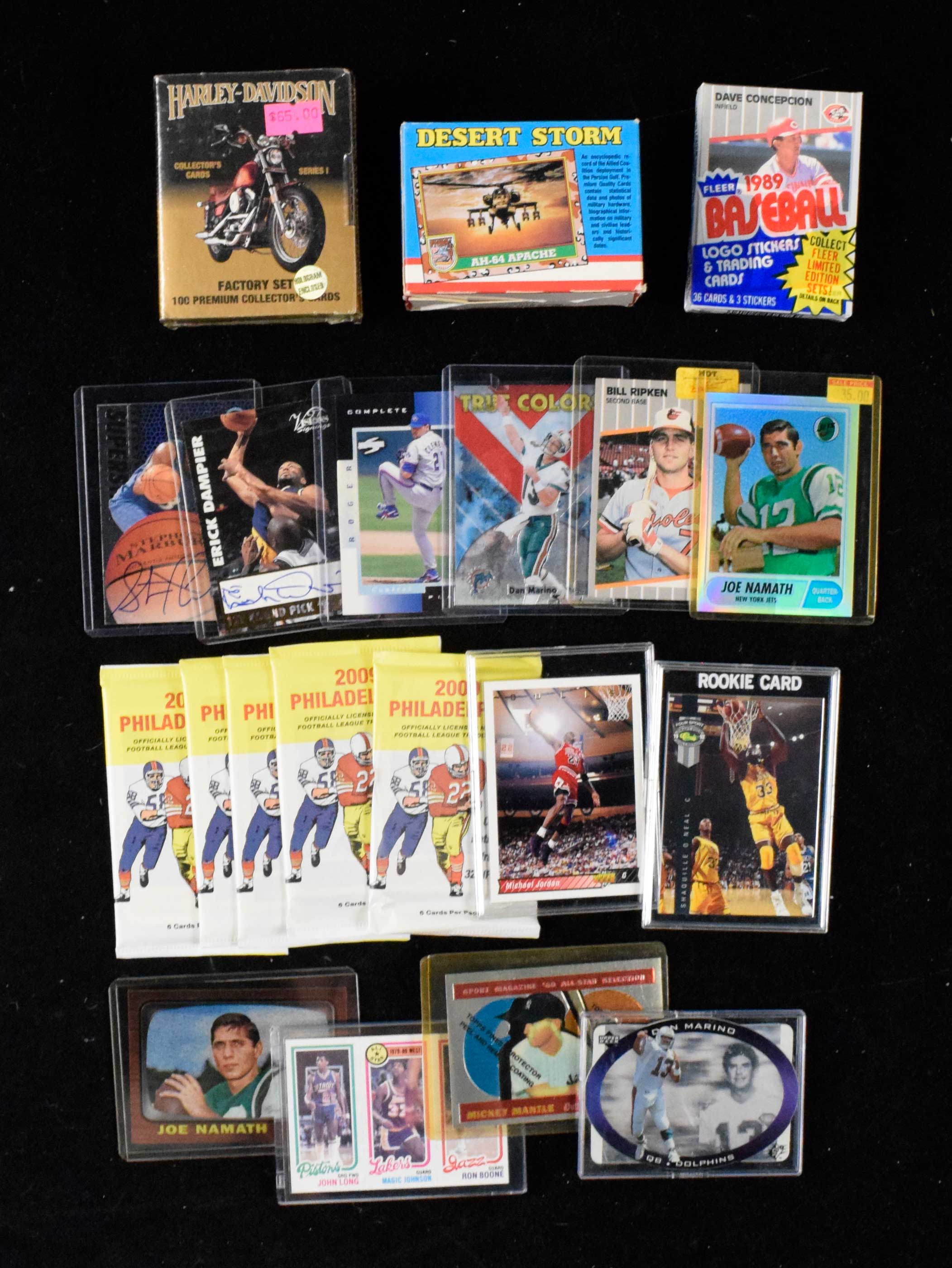 Description:Breakdown value lot of thousands of 1980s-2000s sports cards, including complete sets, packs and inserts (NM-MT). Large lot includes baseball, football, basketball, hockey, racing and other sports cards, as well as numerous nonsports cards and small sets, spanning the mid 1980s through the 2000s (with a few older). Includes several complete sets and unopened packs, as well as thousands of loose cards (some in top loaders and screwdowns) in four shoeboxes and a monster box. Highlights include (19) 2009 Upper Deck Philadelphia unopened packs; (100+) 1988 Donruss and Donruss the Rookies Mark Grace RCs; (4) 1989 Fleer unopened cello packs; 1991 Action Packed football factory-sealed set; (1) 1986 Topps baseball complete set; (2) 1991 Topps Desert Storm factory-sealed glossy sets; numerous small 1980s-1990s sports and nonsports sets; 1991 Topps Archives cards; 1993 Stadium Club basketball Series 1 set; 1993-94 Upper Deck basketball Series 1 set; 1999 Danbury Mint Randy Moss and Randall Cunningham gold cards in binder and many loose cards with players including Michael Jordan, Shaquille O'Neal, Ken Griffey Jr., Troy Aikman, Mickey Mantle, Dan Marino, Roger Clemens, Joe Namath, Magic Johnson, plus many inserts and some certified autograph cards. Most cards appear NM-NM/MT or better with some less here and there.