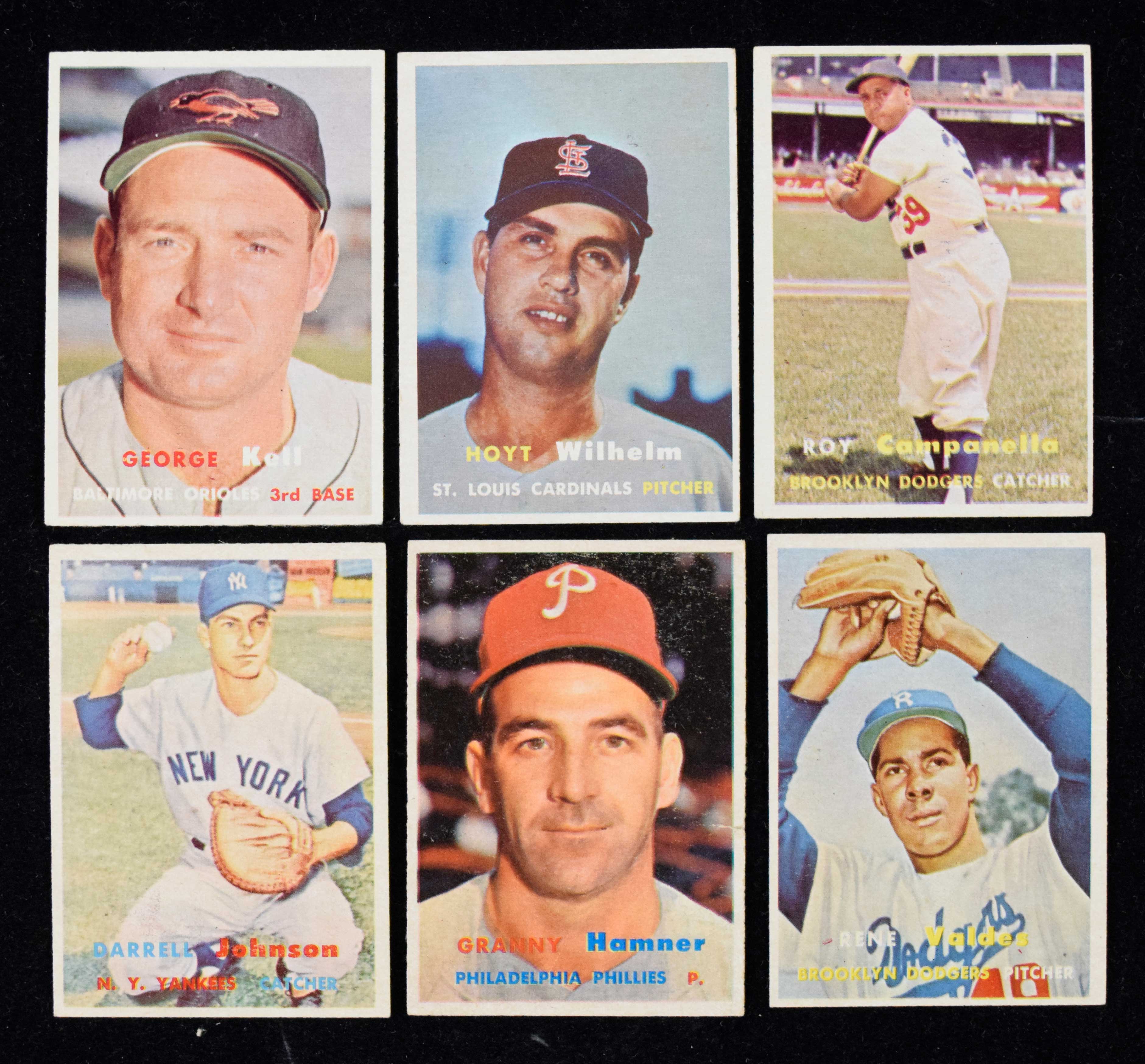 Description:Clean lot of (71) diff. 1957 Topps cards with (16) mid-series cards, Campanella, Wilhelm (VG/EX-EX/MT). Outstanding lot in clean condition overall features (71) different cards, with the card numbers ranging from #s 177 - 349, including (16) cards from the tough mid-series (#s 265 - 352). Other highlights include #s 203 Hoyt Wilhelm (VG/EX), 210 Roy Campanella (VG/EX OC) and 230 George Kell (EX). Balance of the lot, housed mostly in top loaders or penny sleeves, appears mostly EX-EX/MT. Range: VG/EX-EX/MT.