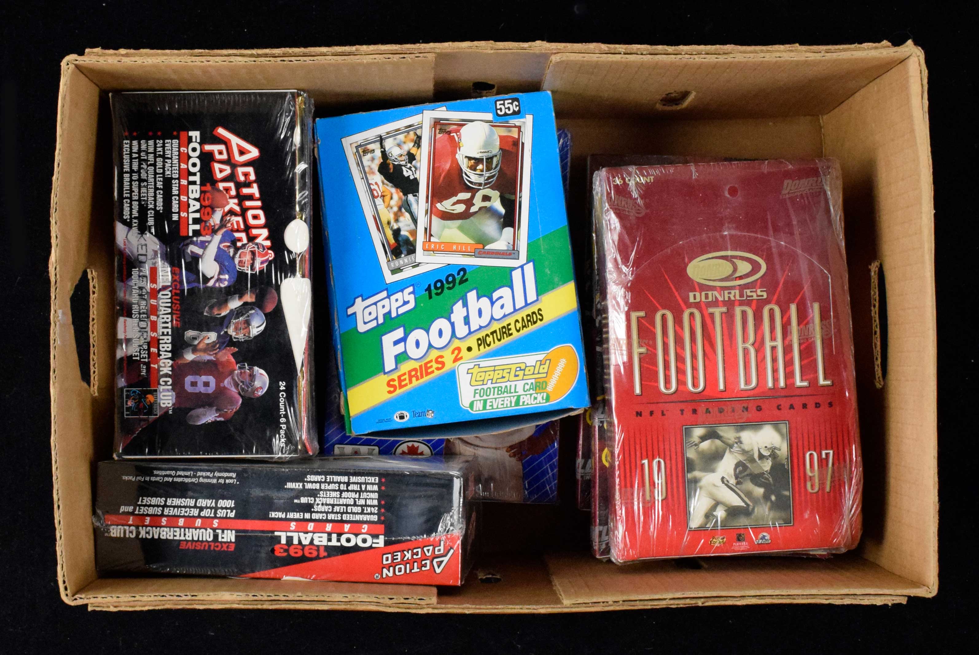 Description:Lot of (8) 1991-1997 football hobby boxes, with Topps & Donruss and most sealed (EX-NM/MT). Nice lot of original football unopened material, with all factory-sealed unless noted below. Includes (1) 1991 Canadian Football hobby box; (1) 1992 Topps Series 2 hobby box (not sealed); (3) 1993 Action Packed hobby boxes; (2) 1997 Score hobby boxes and (1) 1997 Donruss hobby box. Boxes have light to moderate shelf wear: EX-NM/MT.