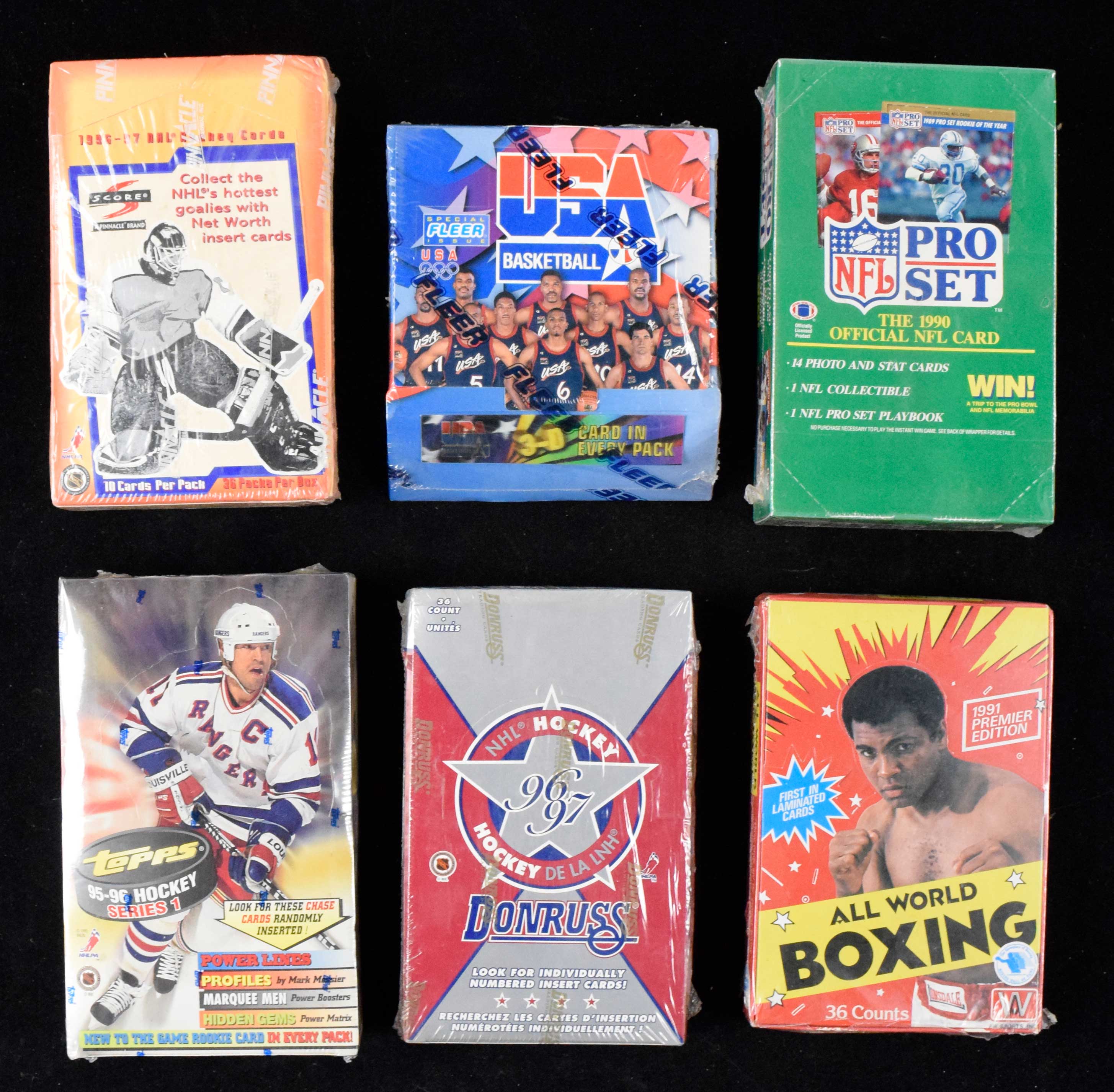 Description:Mixed-sport lot of (12) 1990s hobby boxes and sets, including sealed 1996 Fleer USA basketball (VG/EX-NM/MT). Good quantity of assorted wax and hobby boxes, with (2) baseball: (1) 1992 Leaf Series 1 and (1) 1992 The Baseball Enquier partial hobby box with (21) unopened packs; (1) basketball: 1996 Fleer USA basketball factory-sealed hobby box with 3D cards; (4) hockey: (2) 1996-97 Score hobby boxes (one box is factory-sealed and the other is open and missing two packs), (1) 1995-96 Topps Series 1 factory-sealed hobby box and (1) 1996-97 Donruss factory-sealed box; (3) football: (1) 1989 Swell Football Greats factory-sealed set; (1) 1990 Score Series 1 partial hobby box (missing 6 packs) and (1) 1990 Pro Set factory-sealed hobby box and (2) other sports: (1) 1991 All World Boxing factory-sealed hobby box and (1) 1991 All World Racing factory-sealed hobby box. Boxes have light to heavy shelf wear: VG/EX-NM/MT.