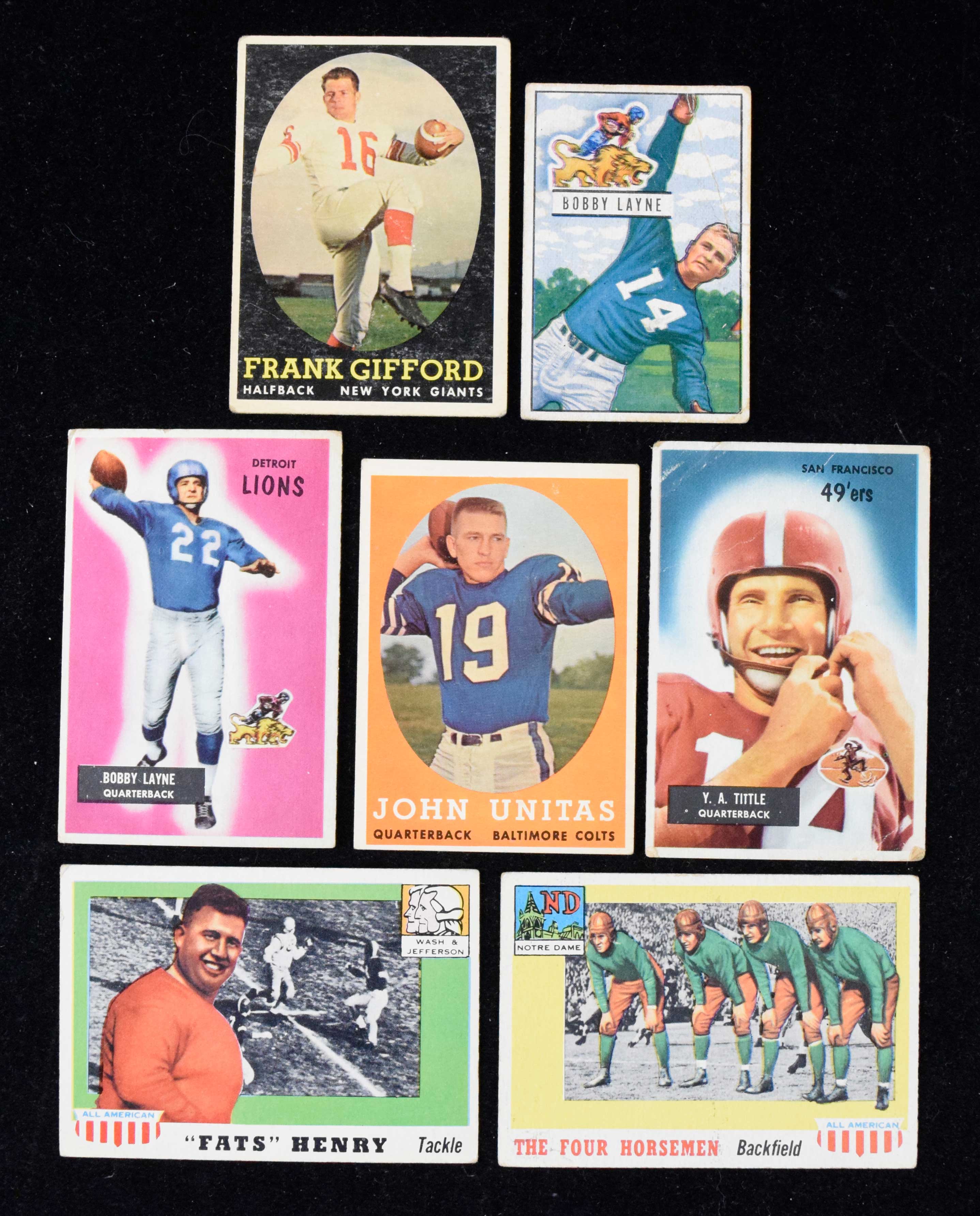 Description:Lot of (7) 1951-1958 Topps and Bowman HOFers and RCs, including Bobby Layne, Four Horsemen (PR-VG/EX). High-value but generally low-grade lot includes 1951 Bowman #102 Bobby Layne (PR); (2) 1955 Topps All American: #s 68 The Four Horsemen RC (PR) and 100 Fats Henry RC (VG); (2) 1955 Bowman: #s 72 Y.A. Tittle (PR) and 71 Bobby Layne (GD) and (2) 1958 Topps: #s 22 Johnny Unitas (VG/EX) and 73 Frank Gifford (FR). Range: PR-VG/EX.