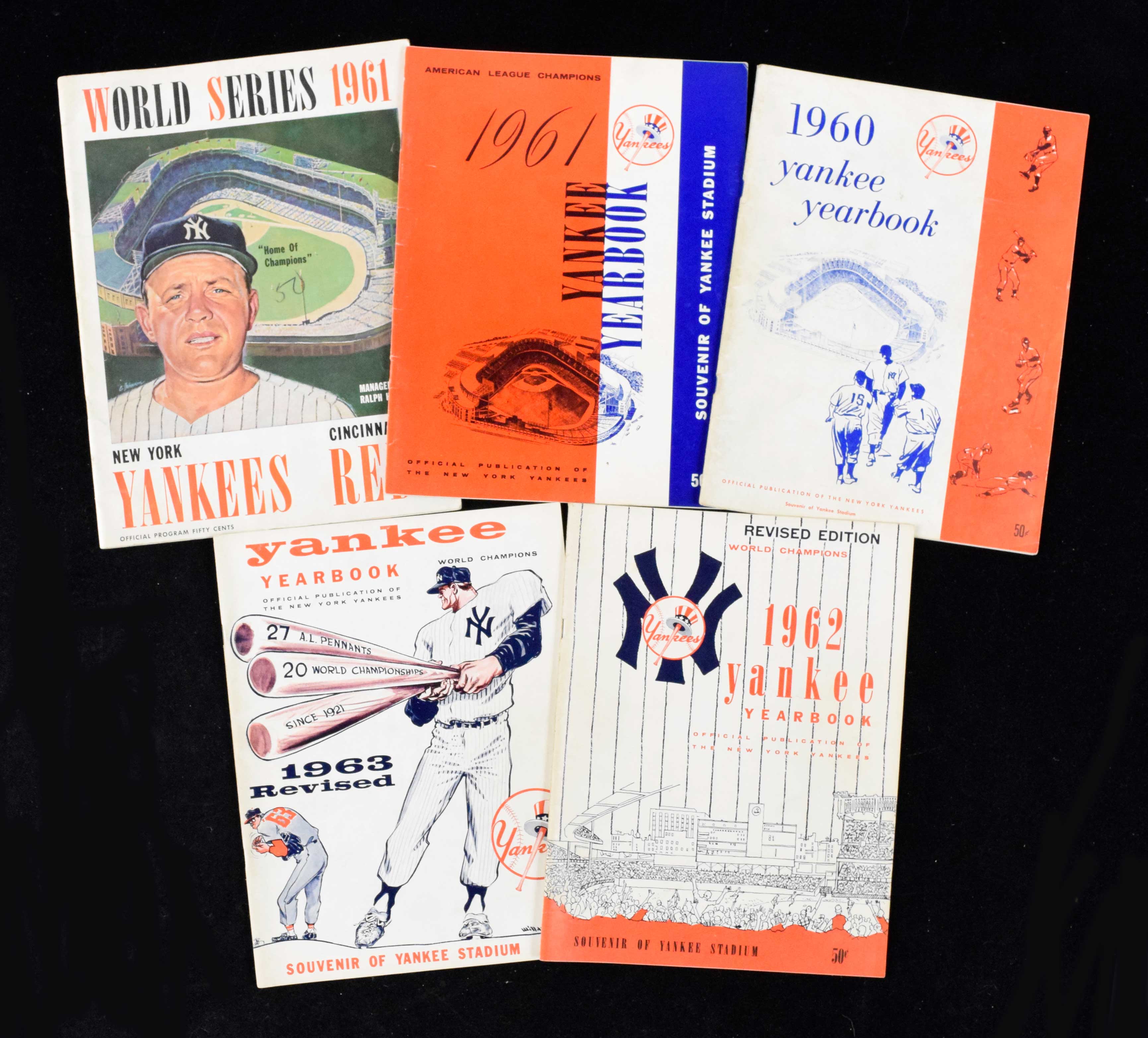 Description:Lot of (12) 1960-1969 New York Yankees yearbooks and programs (VG/EX-EX/MT). Good quantity of official New York Yankees publications, with yearbooks from 1960, 1961, 1962, 1963, 1964, (2) 1965, 1966, 1967, 1968 and 1969 and (1) 1961 Yankees World Series program vs. Reds. Range: VG/EX-EX/MT.