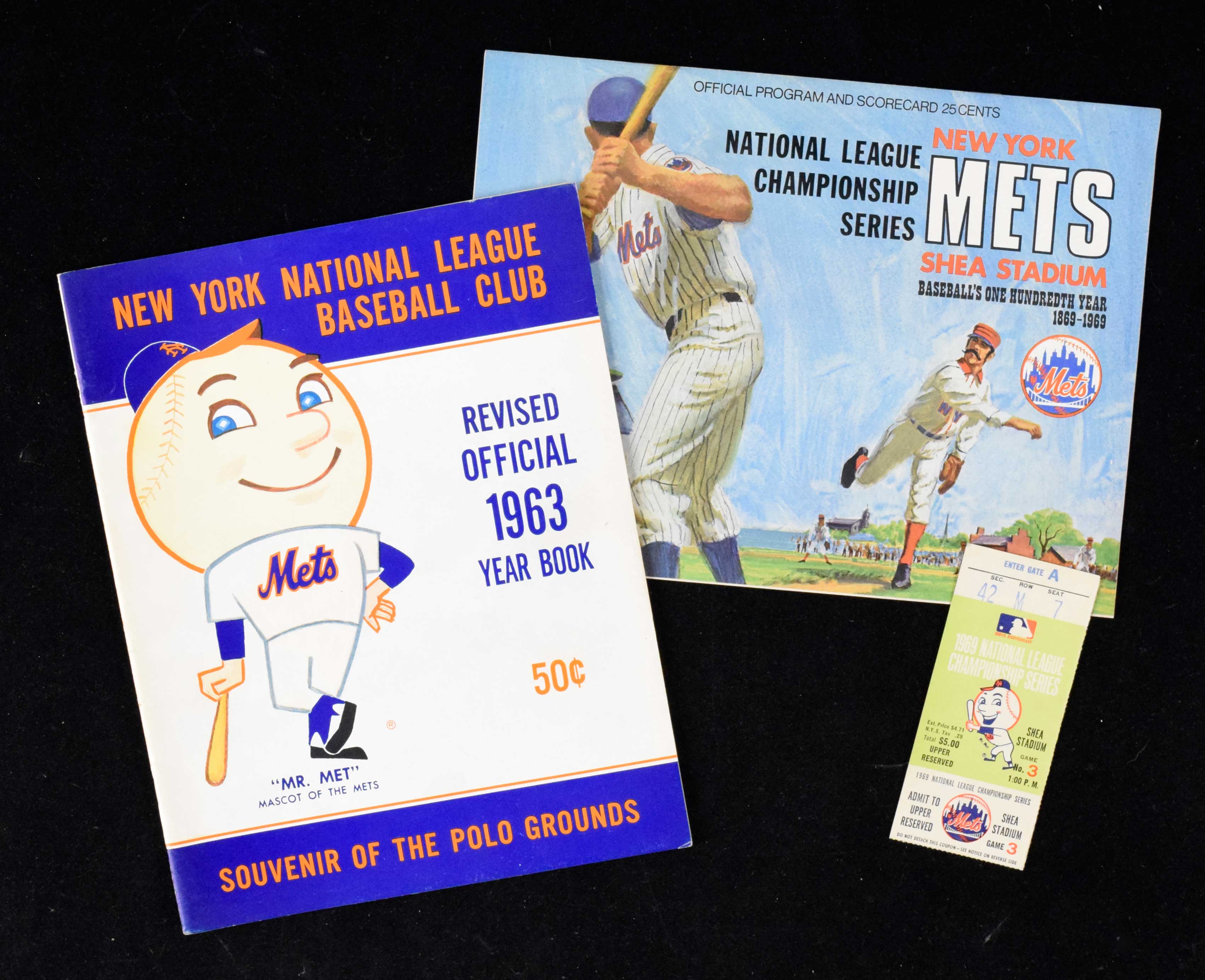 Description:1963-1969 N.Y. Mets program, yearbook and 1969 NLCS Game 3 ticket stub (VG-EX/MT). Nice assortment of New York Mets memorabilia, with (1) 1963 official yearbook (EX/MT); (1) 1969 NLCS program and scorecard (EX/MT; unscored) and (1) 1969 NLCS Game 3 ticket stub (VG small paper loss on reverse near tear line; series clincher against the Braves). Range: VG-EX/MT.