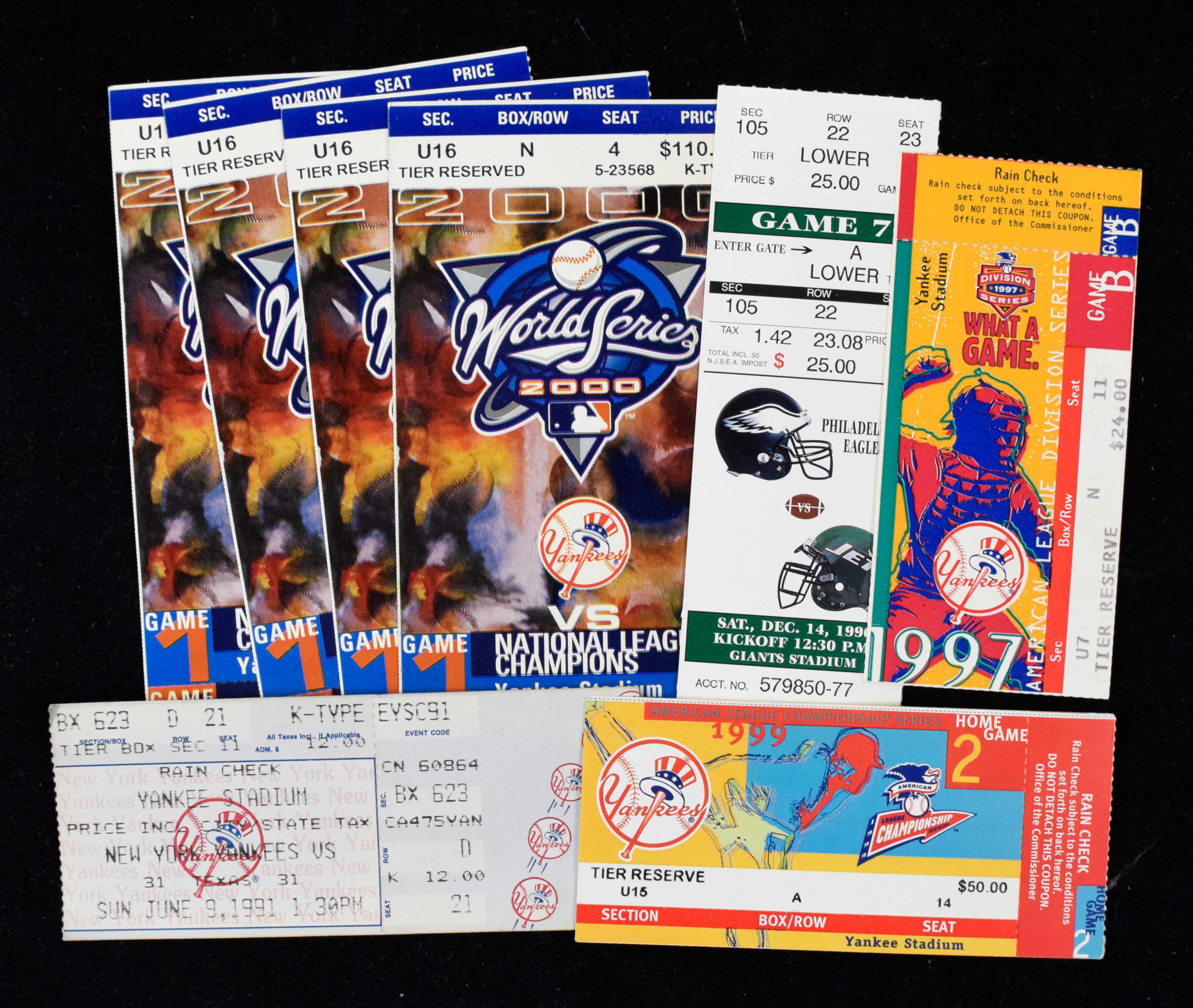 Description:Lot of (20+) 1980s-2000s mostly New York sports teams tickets & stubs, including 2000 World Series (PR-EX/MT). Assortment of mostly 1990s-2000s New York sports team ticket stubs (with a few others) is highlighted by (4) 2000 World Series Game 1 stubs; (4) 2000 NLCS Game 2 stubs; (2) 1999 ALCS Game 2 stubs; (2) 1997 ALDS Game B stubs; (3) Dec. 14, 1996 Philadelphia Eagles at New York Jets full tickets, Jets playoff phantom tickets and more. Range: PR-EX/MT.