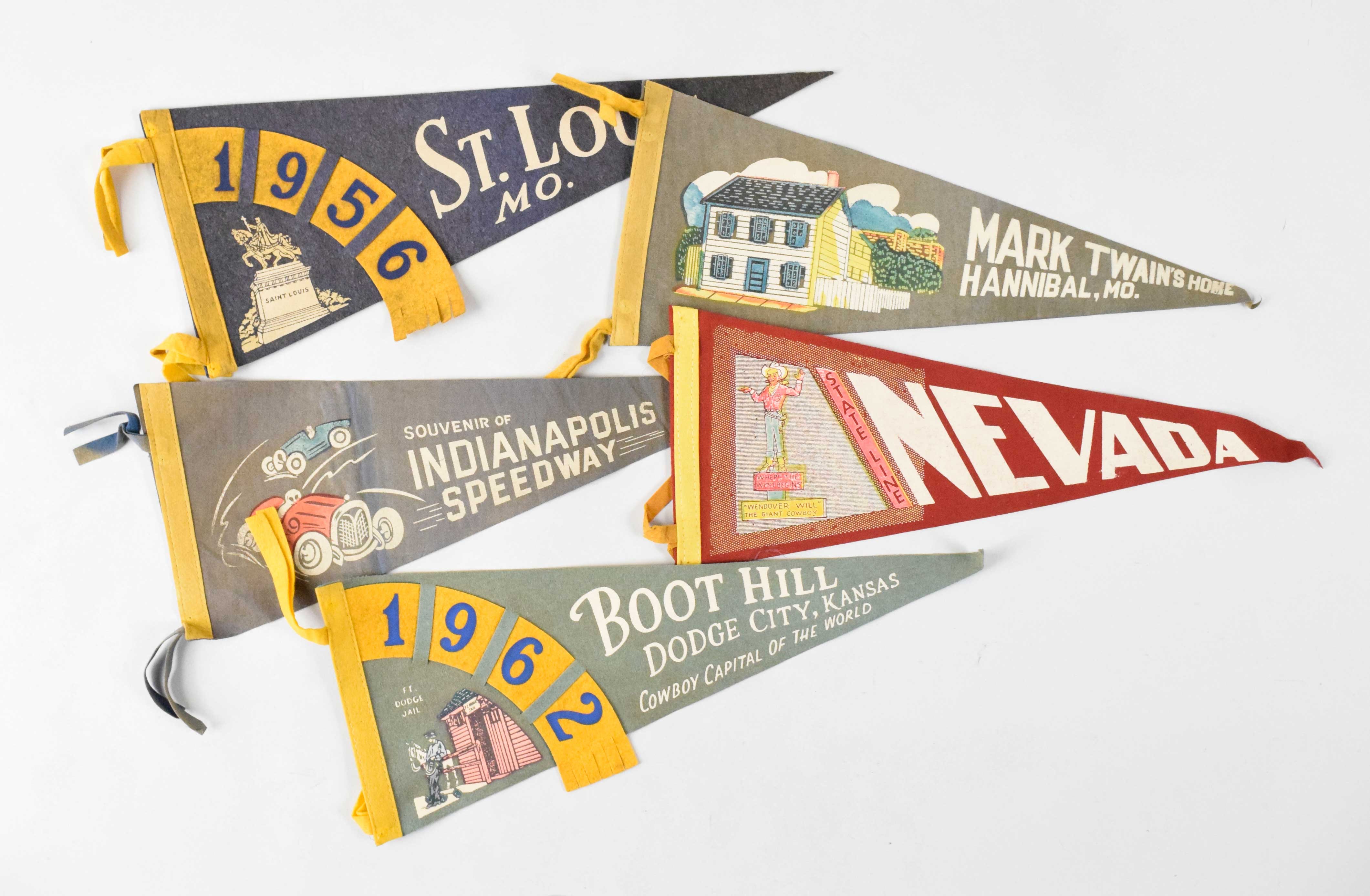Description:Lot of (10) 1950s-1960s nonsport souvenir mid-size pennants, including travel, cities (GD-VG/EX). Nice assortment of vintage felt pennants, most measuring approx. 18" long or slightly smaller with tassles. Includes (1) Lake Winnipesaukee, N.H.; (1_ 1964 Las Vegas, Nevada; (1) Hampton Beach, N.H.; (1) Colorado Springs, Colo.; (1) 1962 Boot Hill Dodge City, Kansas; (1) Nevada State Line; (1) 1956 St. Louis, Mo.; (1) Hannibal, Mo. Mark Twain's Home; (1) Indianapolos Speedway and (1) Laconia, N.H. Pennants appear mostly VG-VG/EX, all with tack holes. Range: GD-VG/EX.