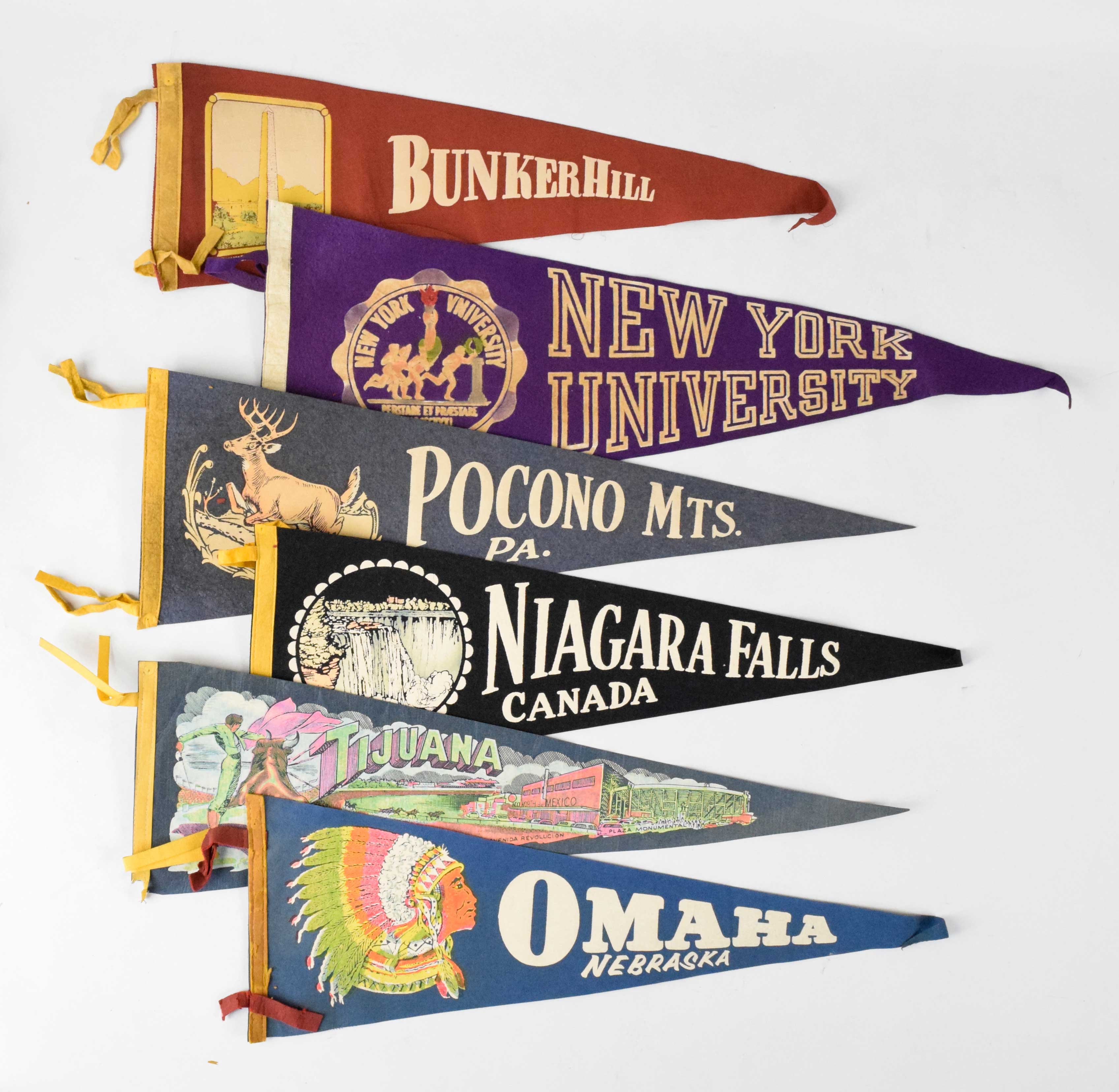 Description:Lot of (17) 1950s-1970s mostly nonsport souvenir full-size pennants, including travel, states (GD-VG/EX). All range in size from 26"-30," with highlights including (1) Mt. Vernon, Va.; (1) New York University; (1) Bunker Hill; (1) Maryland; (1) Pocono Mountains, Pa.; (1) Williamsburg, Va.; (1) Jamestown, Va.; (1) Kansas City; (1) San Francisco; (1) Niagra Falls; (1) Delaware; (1) Tijuana; (1) Omaha, Nebrask and more. Pennants appear mostly VG-VG/EX, most with tack holes. Range: GD-VG/EX.