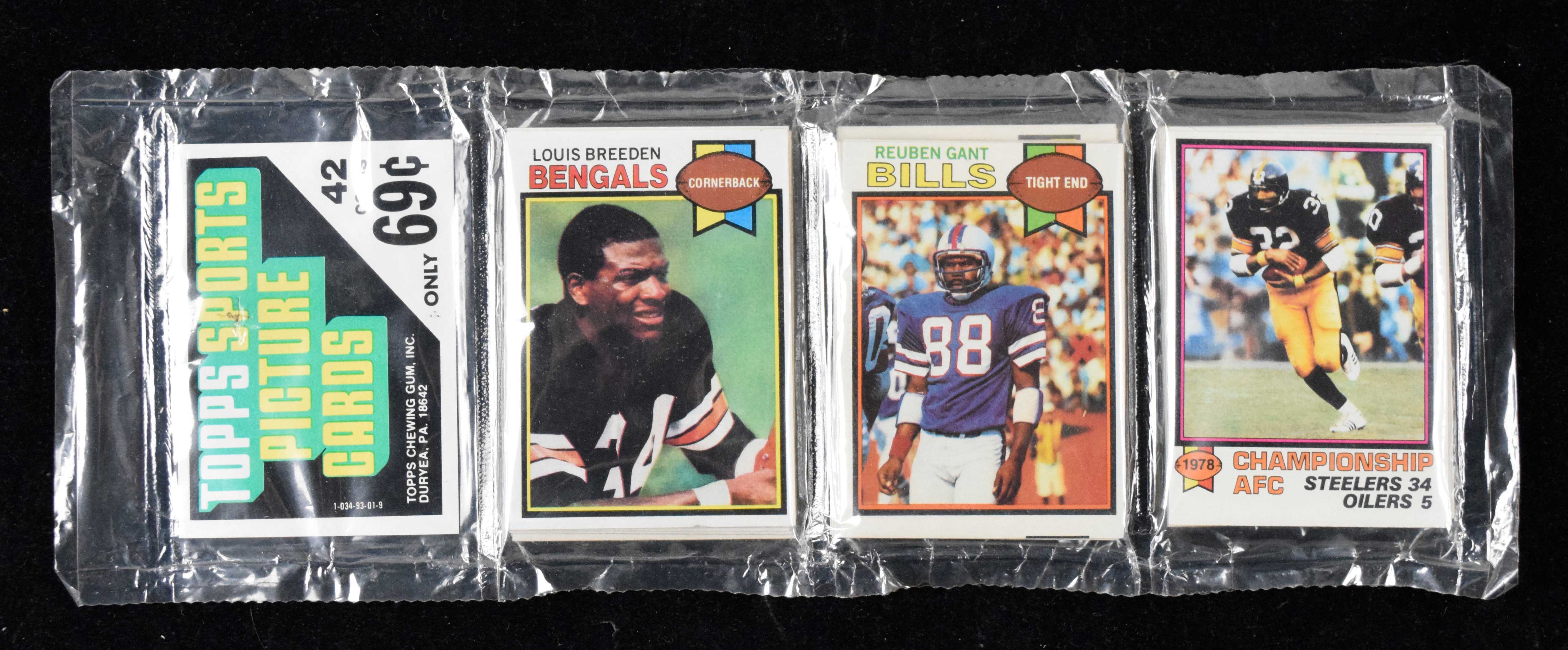 Description:1979 Topps football unopened rack pack with two Hall of Famers showing (NM). Outstanding original Topps rack pack has a Franco Harris playoff card #166 showin on top, and #485 John Hannah showing on the reverse. Pack remains tightly sealed, with a small notch on the bottom border of the Louis Breeden card on top, noted for accuracy. Several rookie cards are possible in the pack, including Earl Campbell. Pack remains tightly sealed: NM.