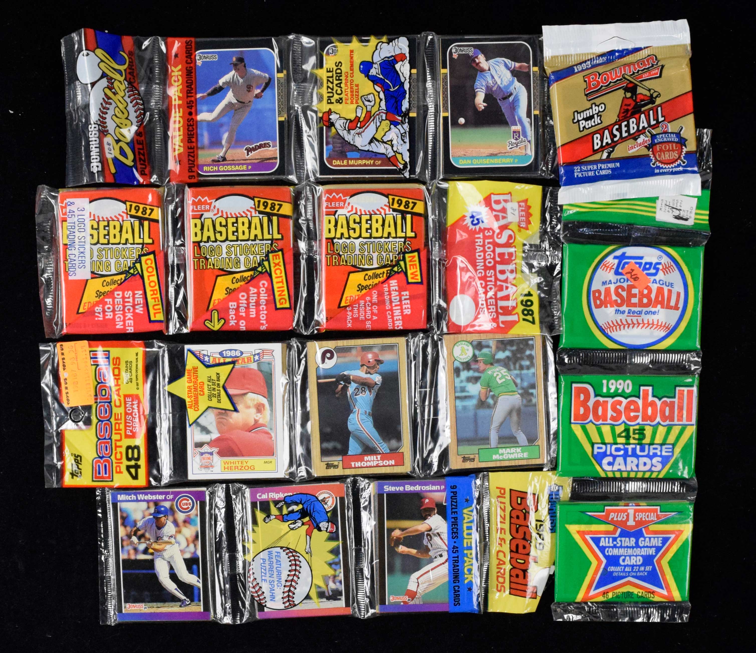 Description:Lot of (90+) 1987-1993 unopened rack, cello and wax packs, including 1987 Fleer and Donruss (EX/MT-MT). Good quantity of unopened material, with the majority of the lot consisting of baseball rack packs from the late 1980s through early 1990s, plus approx. (20+) assorted wax, cello and foil packs mixed in. Also includes a few football packs. Highlights include (4) 1987 Donruss rack packs; (13) 1989 Donruss rack packs; (2) 1993 Bowman Jumbo foil packs; (4) 1990 Topps rack packs; (3) 1987 Fleer rack packs; (3) 1987 Topps rack packs; (5) 1987 Donruss wax packs and more. Also included are roughly (800) loose 1990 Donruss cards (not in packs). Packs are tightly sealed, with most appearing NM or better. Range: EX/MT-MT.