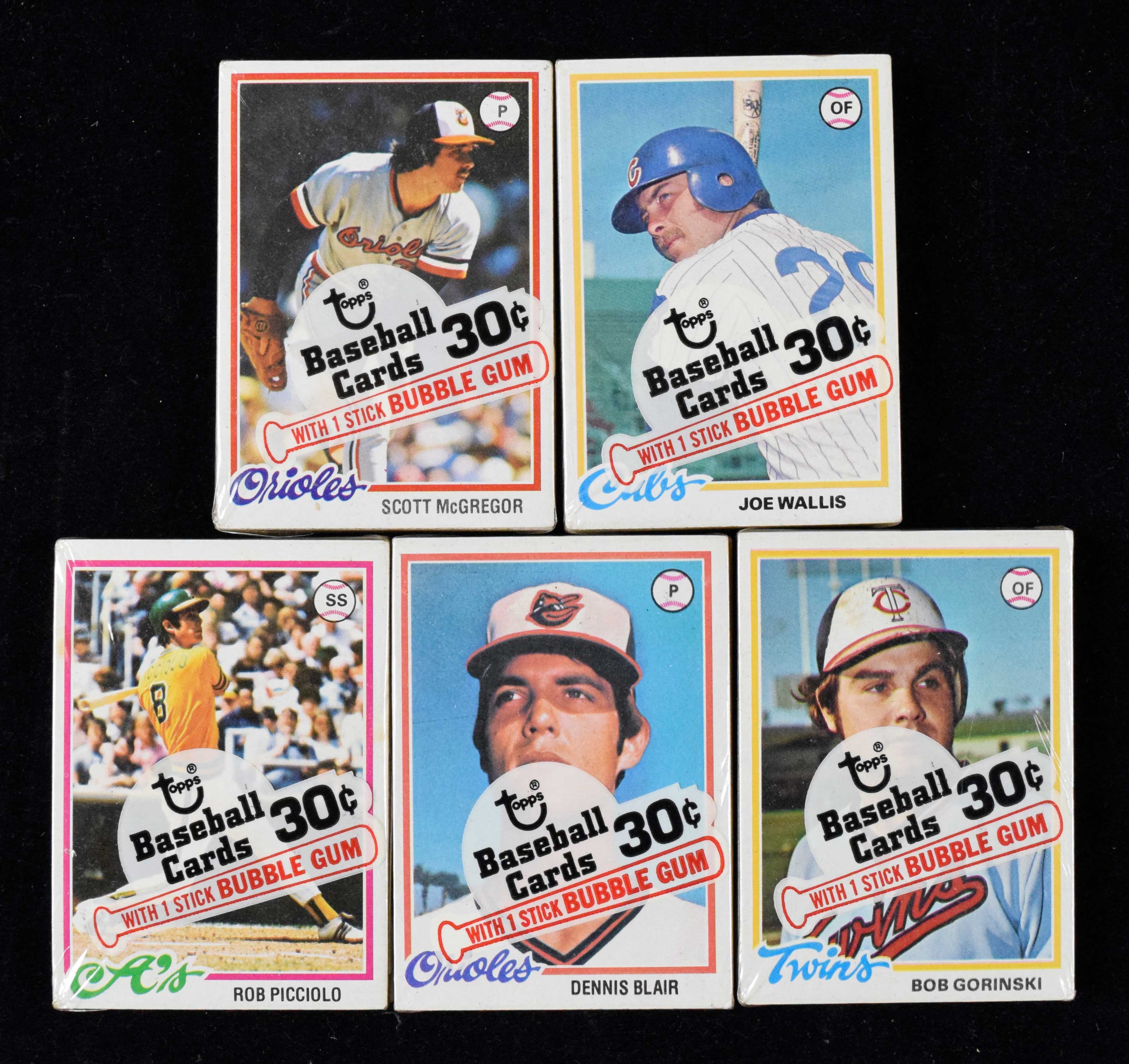 Description:Lot of (5) 1978 Topps baseball unopened cello packs (NM). Outstanding lot of 1978 Topps unopened cello packs, each with (21) cards and a stick of gum sandwiched in the middle. Commons are showing on the fronts and backs, with a few top cards showing light corner wear. All packs have tight seals on the backs: NM.