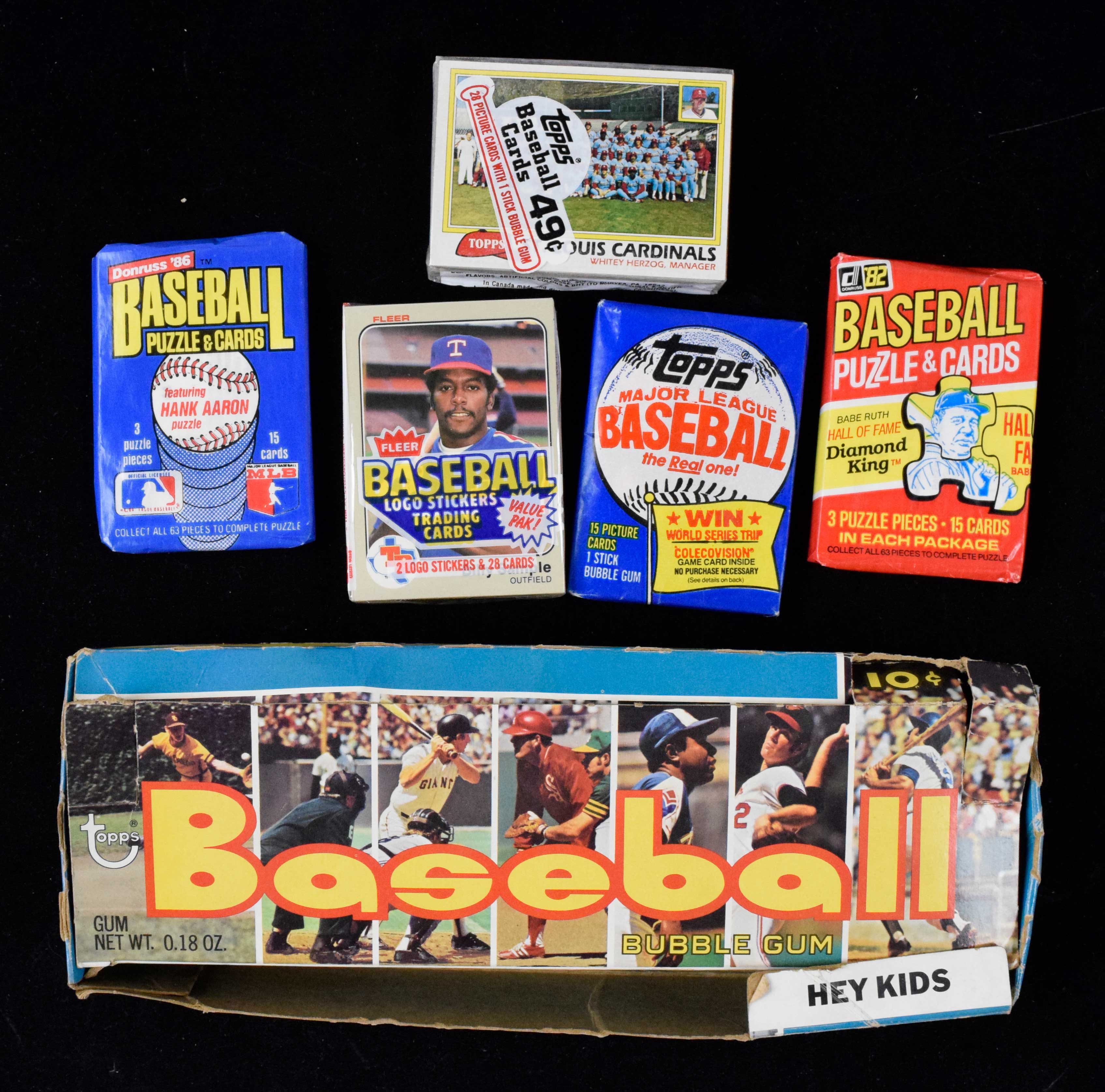 Lot of (23) unopened 1981-1986 wax and cello packs, plus 1973 Topps empty display box (EX/MT-NM). All packs are unopened with tight seals. Includes (3) 1981 Topps cello packs; (3) 1983 Topps wax packs; (3) 1982 Donruss wax packs; (9) 1983 Fleer cello packs and (5) 1986 Donruss wax packs. Also included is (1) 1973 Topps empty display box (VG; lid partially seperated). Packs: EX/MT-NM. Empty box: VG.