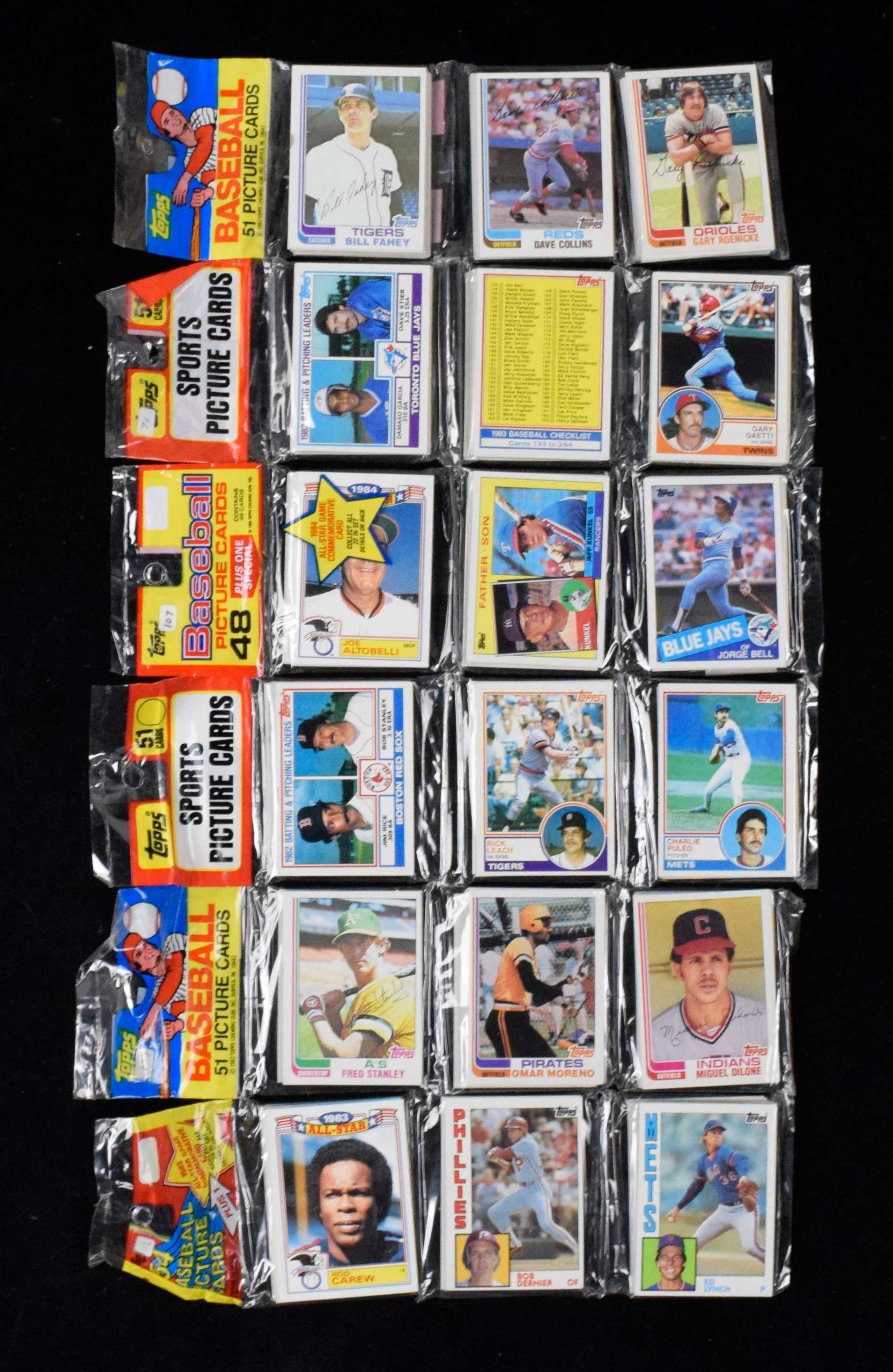 Description:Lot of (22) 1982-1985 Topps unopened rack packs (NM-NM/MT; see description). Nice lot of early 1980s Topps unopened rack packs, with numerous key rookie cards possible in each year. Includes (2) 1982 Topps; (9) 1983 Topps; (6) 1984 Topps; and (5) 1985 Topps. Several of the packs have small numbers affixed with tape to the headers, and some cards on the tops of the packs have notches/possible fingernail marks. Packs are tightly sealed: NM-NM/MT.