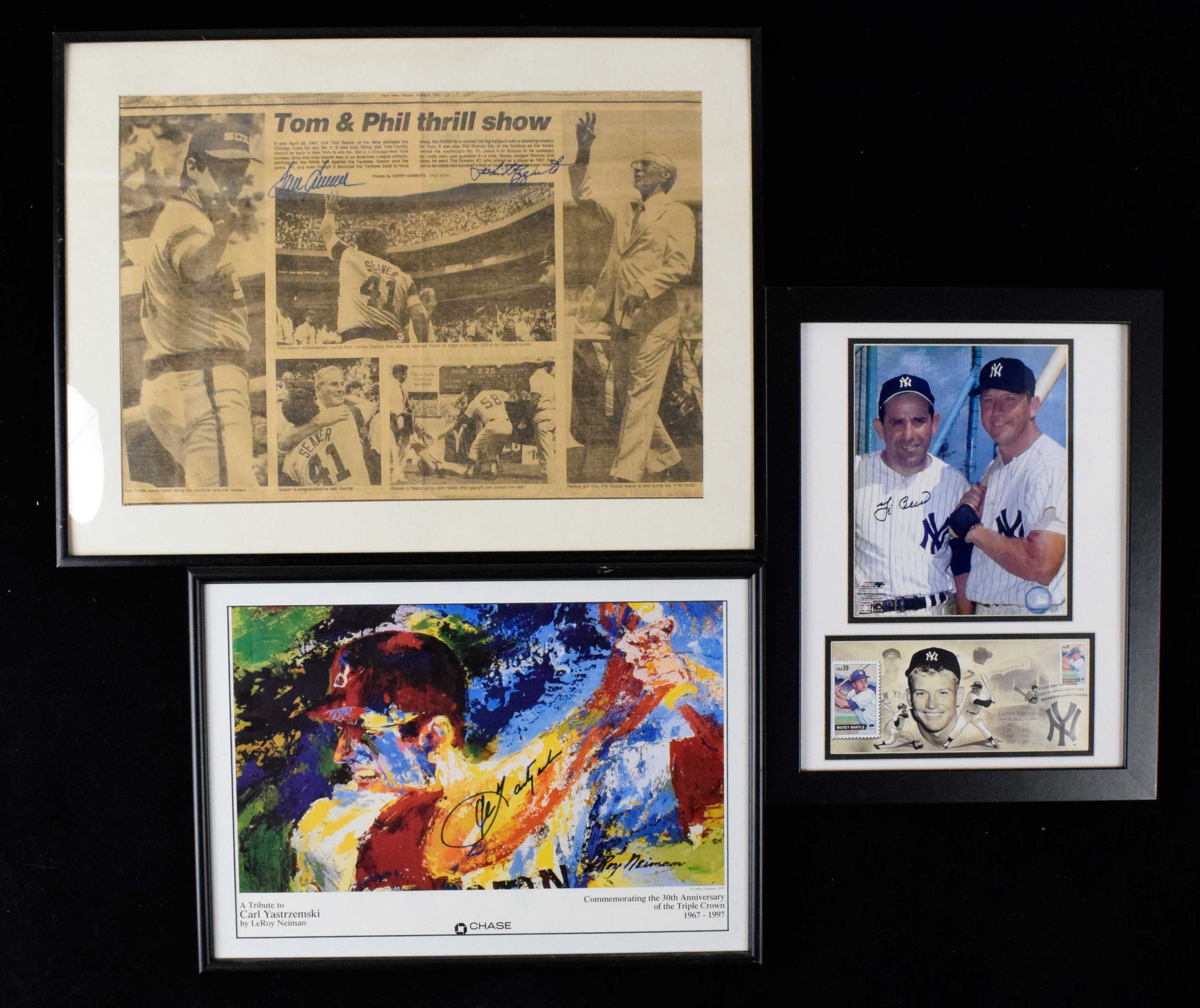 Description:Lot of (5) framed and autographed HOF photos, including Seaver, Berra and Rizzuto (Sigs. EX/MT-MT). Each is framed to 24"x18" or smaller, with (1) newspaper page signed by Phil Rizzuto and Tom Seaver; (1) Bill Purdom Bob Feller lithograph signed by Purdom and Feller with inscriptions (slight fading to Feller signature, rating 6 out of 10); (1) photo of Yogi Berra and Mickey Mantle, signed by Berra; (1) LeRoy Nieman Carl Yastrzemski print signed by Yastrzemski; and (1) Bill Purdom Robin Roberts lithograph signed by Roberts and Purdom. Signatures range from 6 (Feller) to 9 (avg. 8) out of 10, and frames have mostly light wear with a few nicks: EX-NM.