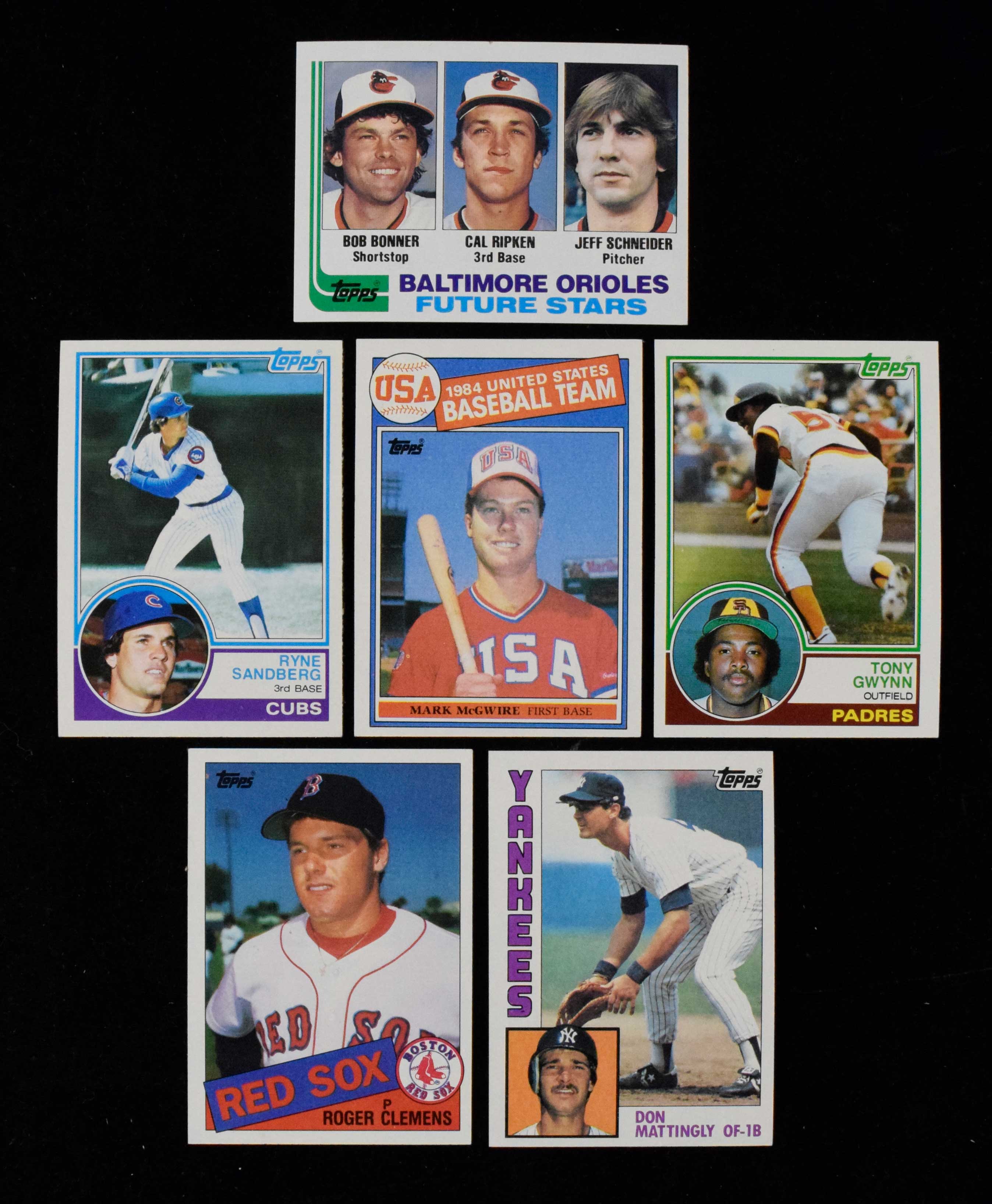 Description:Lot of (7) 1982-1988 Topps complete sets with key RCs (NM-NM/MT overall). Nice lot of complete Topps sets, with one each from 1982, 1983, 1984, 1985, 1986, 1987 and 1988. Key rookie cards include Cal Ripken Jr., Tony Gwynn, Wade Boggs, Ryne Sandberg, Don Mattingly, Mark McGwire, Roger Clemens, Barry Bonds and more. Most cards appear NM-NM/MT or better, with some less here and there. Range: VG/EX-NM/MT.