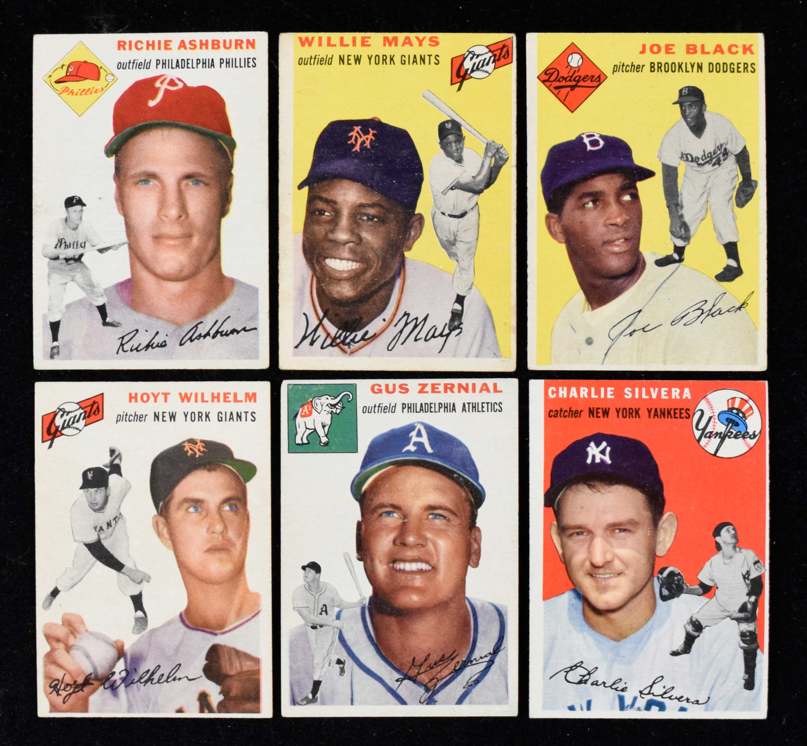 Description:Lot of (33) 1954 Topps cards, including Mays, Ashburn and Wilhelm (GD-VG/EX). Assortment of 1954 Topps cards is highlighted by three Hall of Famers: #s 90 Willie Mays (GD), 45 Richie Ashburn (VG+), and 36 Hoyt Wilhelm (VG/EX). Balance of the lot includes commons and minor stars: #s 2, 9, 11, 14, 19, 23, 24, 27, 28, 29, 31, 40, 76, 78, 86, 87, 39, 91, 92, 96, 97, 98, 99, 104, 108, 109, 114, 117, 121 and 125, with most VG-VG/EX. Range: GD-VG/EX.