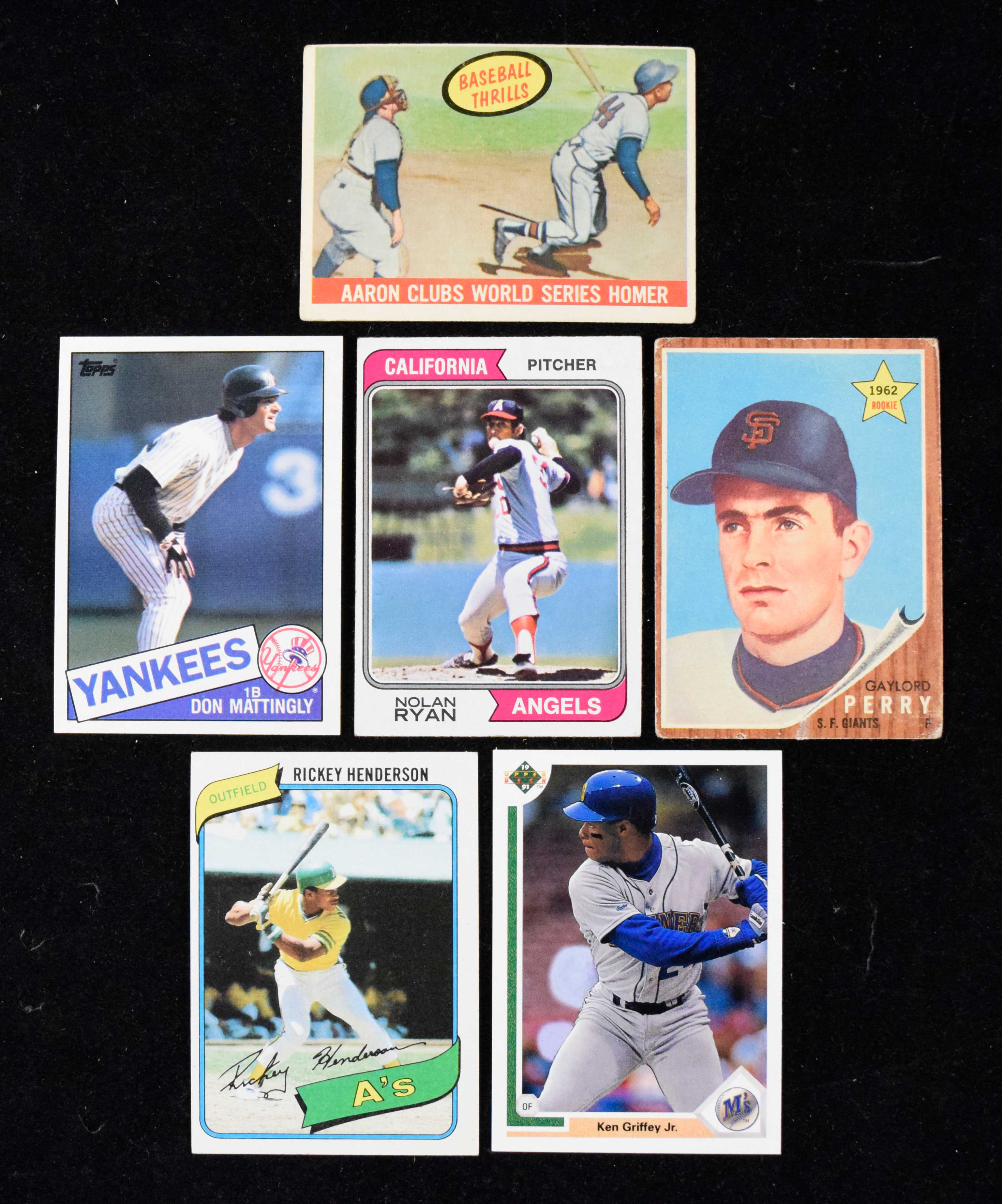 Description:Binder of (500+) 1950s-1990s star and HOF cards, including Aaron, Rose and Henderson RC (PR-MT). Majority of the lot appears to be 1980s & 1990s cards, with some 1950s, 1960s and 1970s sprinkled around. Binder includes almost entirely stars and Hall of Famers with a few exceptions. Highlights include 1959 Topps #467 Hank Aaron Thrills, 1973 Topps #100 Hank Aaron, 1967 Topps #210 Bob Gibson, 1980 Topps #482 Rickey Henderson RC, 1962 Topps #199 Gaylord Perry RC, 1977 Topps #450 Pete Rose, 1974 Topps #20 Nolan Ryan, 1976 Topps #550 Hank Aaron, 1976 Topps #19 George Brett, 1968 Topps #80 Rod Carew, 1972 Topps #79 Carlton Fisk RC, 1976 Topps #476 Dale Murphy RC, 1975 Topps #616 Jim Rice RC, 1978 Topps #400 Nolan Ryan and many more. There is a wide disparity in condition, with the condition generally improving in the modern years. Range: PR-MT.