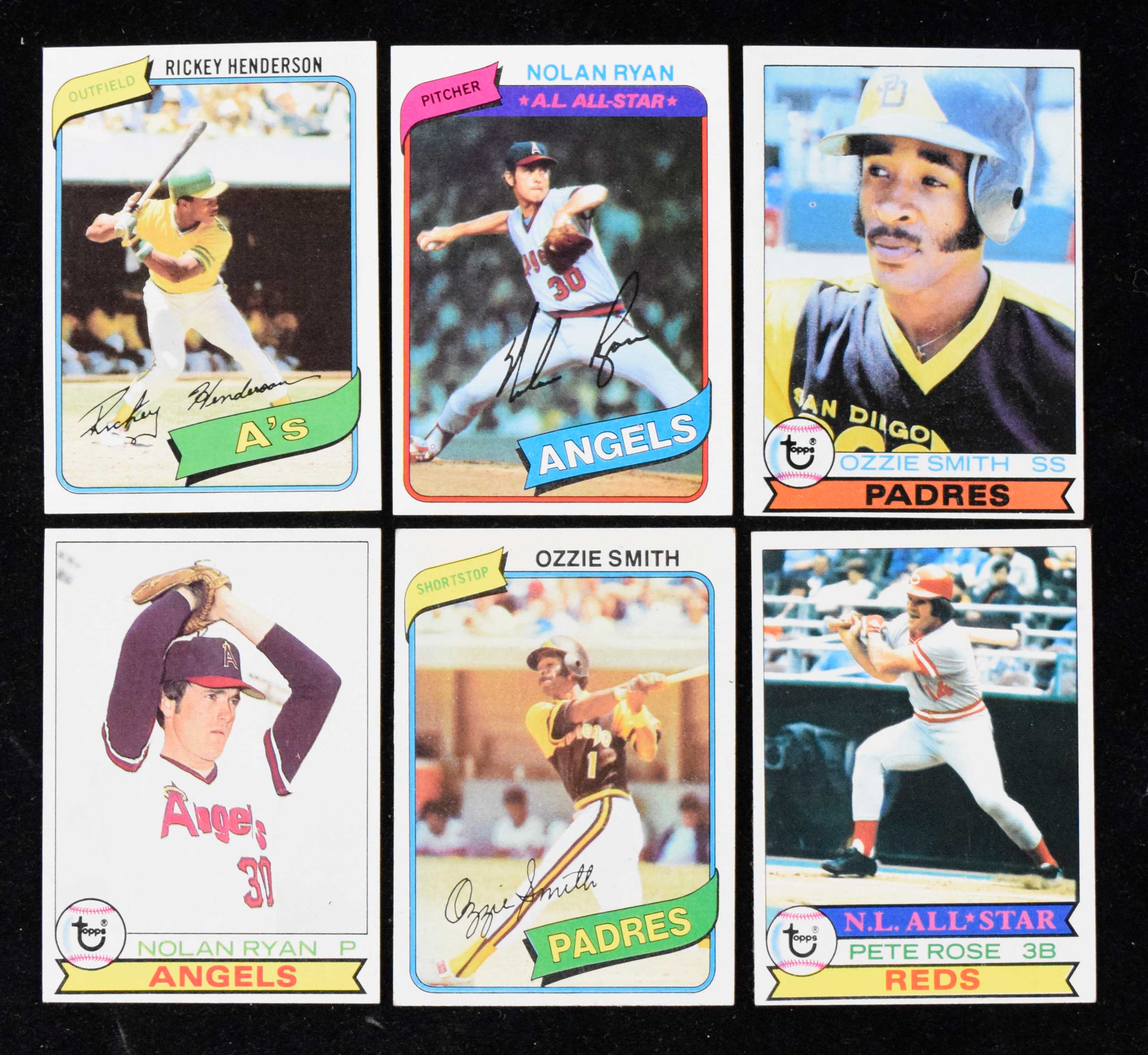 Description:Lot of (2) Topps complete sets, with 1979 and 1980 and Smith, Henderson RCs (VG-NM). Each set has (726) different cards, with the 1979 set highlighted by #116 Ozzie Smith RC (EX/MT OC) and the 1980 set highlighted by #482 Rickey Henderson RC (EX/MT). Both sets also feature numerous Hall of Famers. Balance of the cards appear mostly EX-NM with some lesser and varying centering. Range: VG-NM.