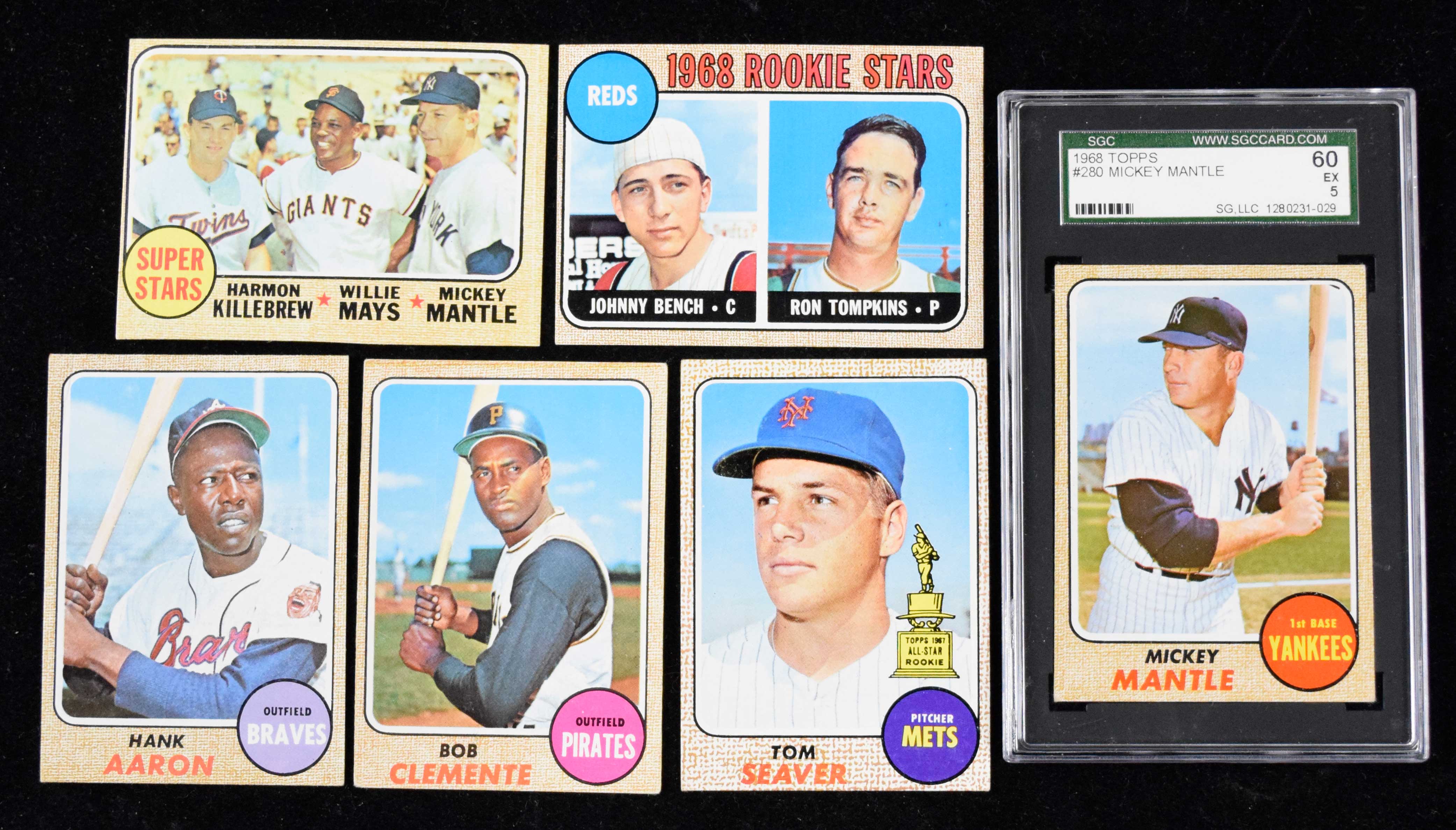 Description:1968 Topps near-complete set (535/598) with HOFers, including SGC 5 Mantle, Bench RC (PR/Trimmed-EX/MT). Lot offers an outstanding start on a 1968 set, with (535) different cards of the 598 issued. Near-set is missing #177 Nolan Ryan RC, 330 Roger Maris, 480 Manager's Dream with Roberto Clemente, 410 Fergie Jenkins, 361 Harmon Killebrew AS, 363 Rod Carew AS, 364 Joe Morgan AS and the remainder mostly commons and high numbers. Key cards include # 280 Mickey Mantle (SGC 5 EX), 247 Johnny Bench RC (VG OC), 490 Harmon KillebrewWillie Mays/Mickey Mantle (EX OC), 230 Pete Rose (VG/EX), 110 Hank Aaron (VG/EX), 150 Roberto Clemente (VG OC), 50 Willie Mays (Trimmed) and 45 Tom Seaver (VG OC). Balance of the lot, housed in pages and a binder, appears mostly VG/EX with some better and some worse, including a few trimmed. Range: PR/trimmed-EX/MT.