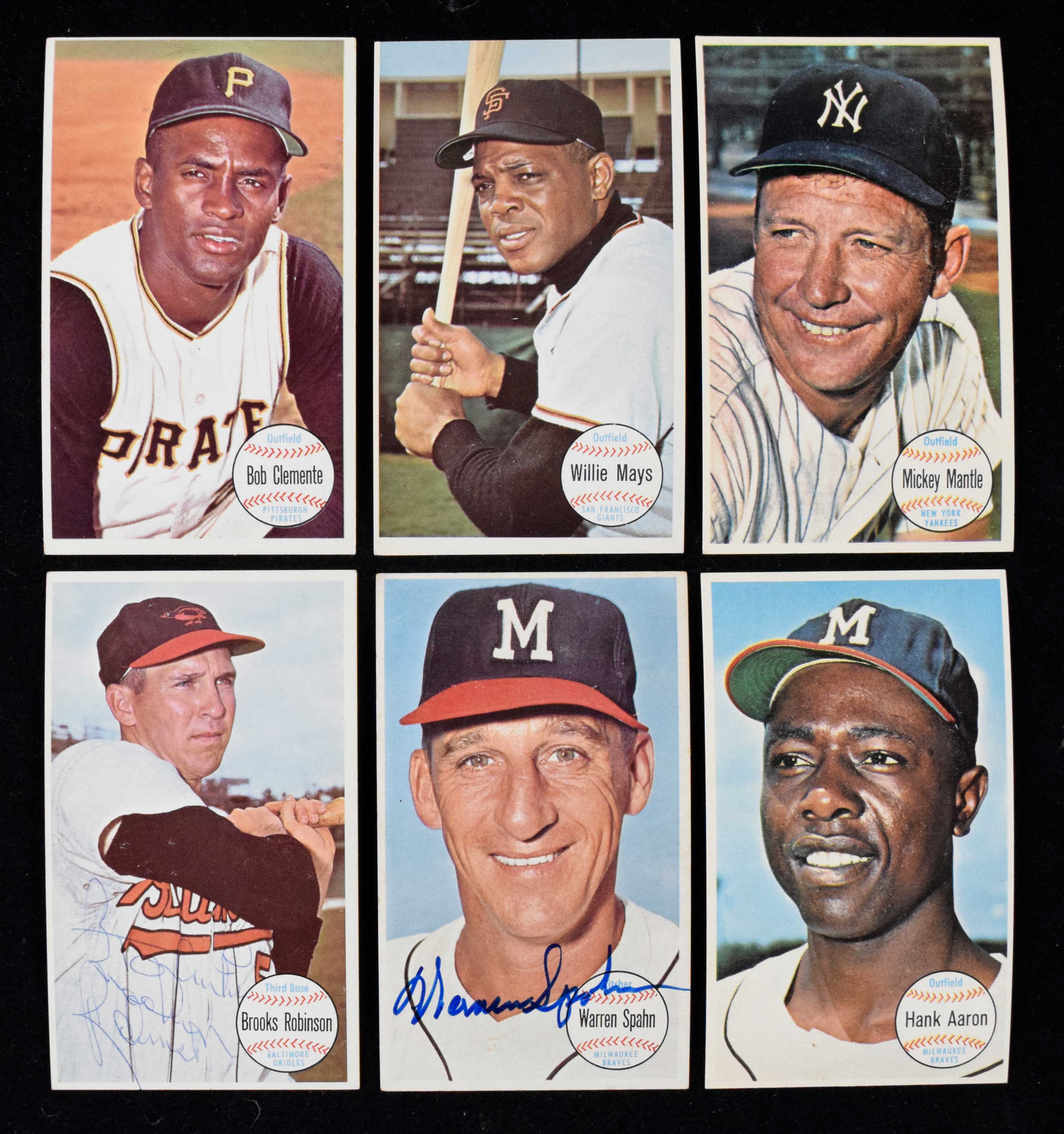 Description:1964 Topps Giants near-complete set (58/60) with Mantle, Mays and (5) autographed (PR-EX/MT). Near-complete oddball set is missing only short print #s 5 Sandy Koufax and 45 Wayne Causey for completion. Includes (5) autographed cards #s 50 Brooks Robinson, 31 Warren Spahn, 44 Tony Oliva (personalized) and (2) 43 Tommy Davis. Non-autographed #s 50 Robinson and 31 Spahn are also included, for a total of (3) extra duplicates. Non-autographed keys include #s 51 Willie Mays (miscut), 49 Hank Aaron (EX), 25 Mickey Mantle (VG/EX) and 11 Roberto Clemente (VG/EX). Balance of the lot appears mostly VG/EX with some better and some worse. Autographs rate 7/8 out of 10, and cards range: PR-EX/MT