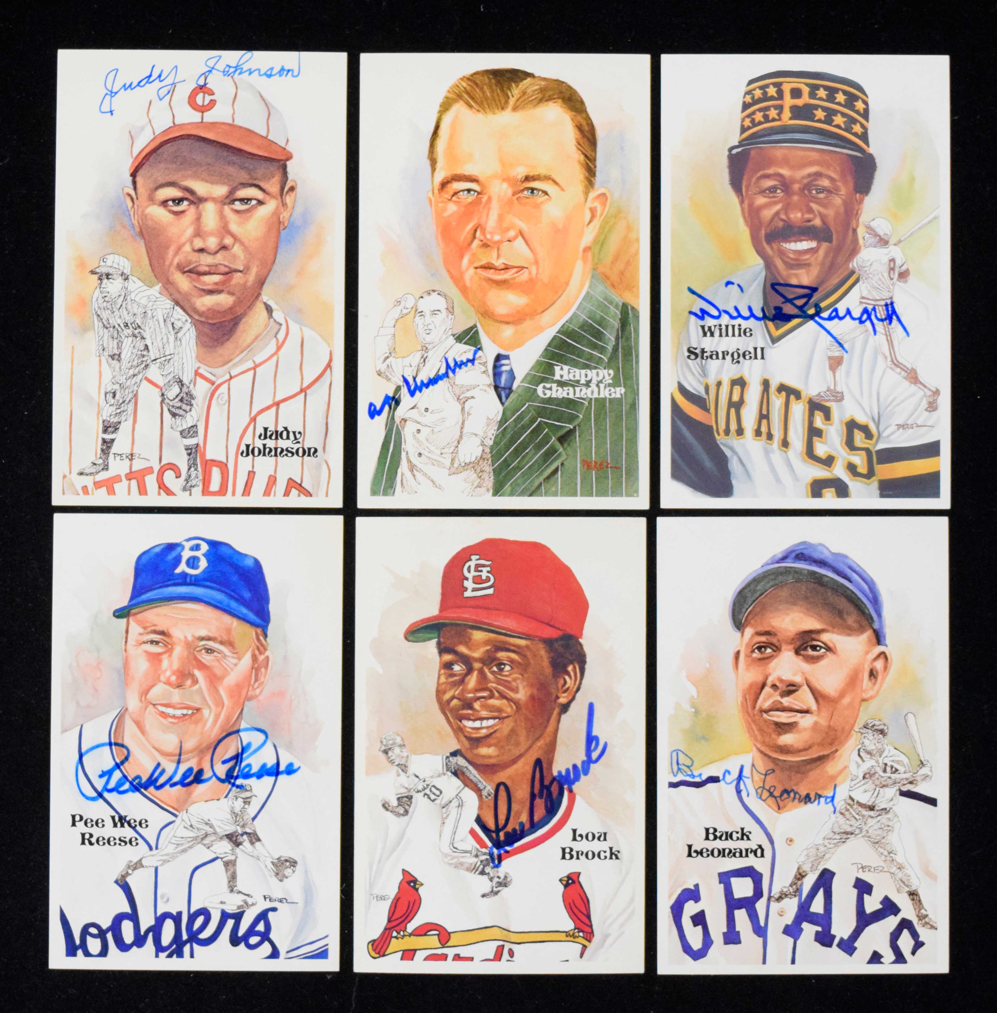 Description:Lot of (14) autographed Perez-Steele HOF postcards, including Johnson, Stargell and Leonard (Sigs. NM-NM/MT). Nice quantity of Perez-Steele postcards, each individually signed on the front by Bill Terry, Buck Leonard, Monte Irvin, Billy Herman, Judy Johnson, Eddie Mathews, Happy Chandler, Frank Robinson, Brooks Robinson, Pee Wee Reese, Lou Brock, Hoyt Wilhelm, Willie Stargell and Al Barlick (twice signed; one smudged). Signatures range from 7 to 9 (avg. 8/9) out of 10, and postcards range VG-NM.