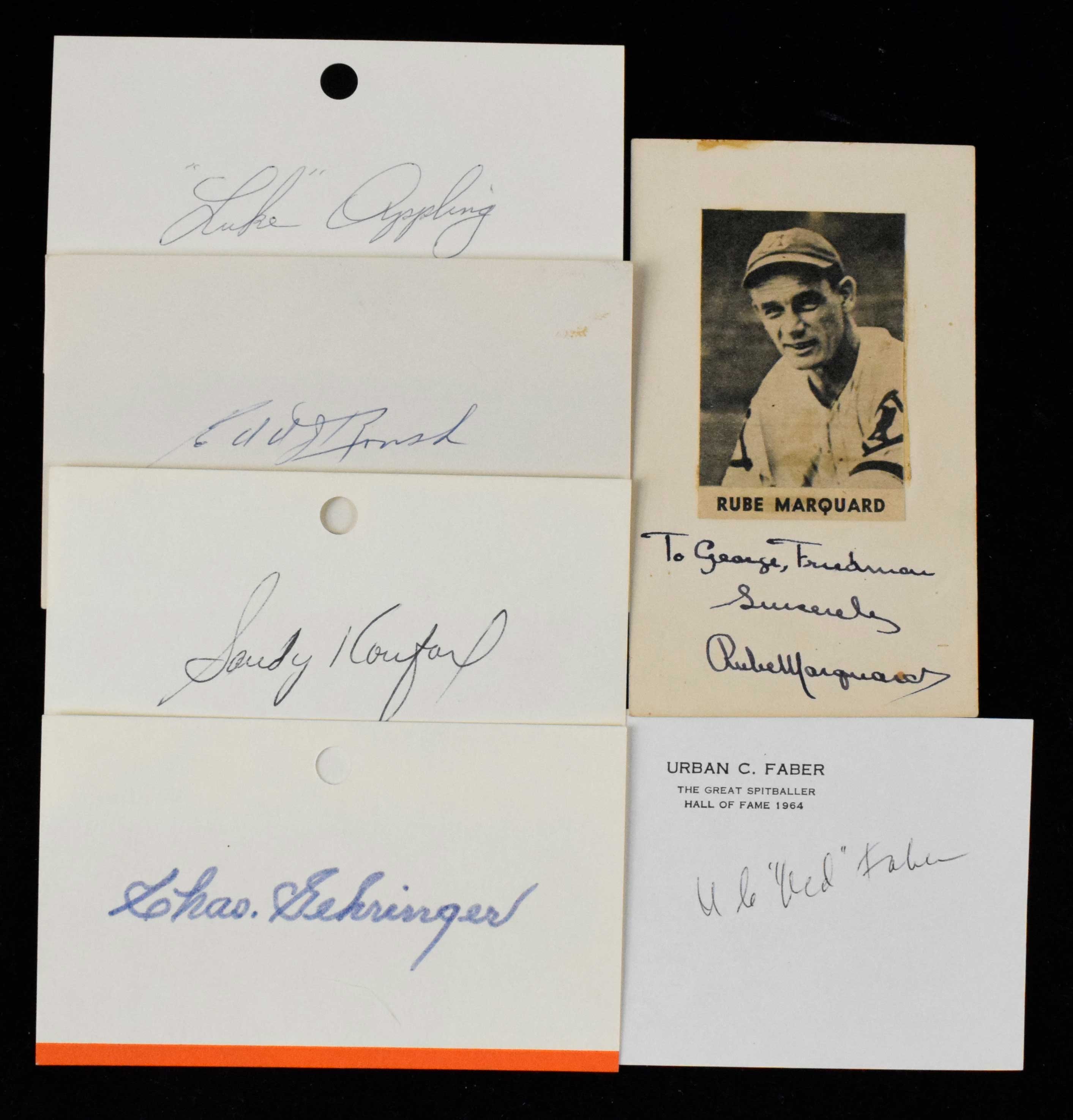 Description:Lot of (20) HOFer autographed index cards, including Koufax, Marquard and Gehrigher (Sigs. NM-MT). Each is signed by a Hall of Famer on an index card, with a few having cutout photos affixed as well. Includes Sandy Koufax, Rube Marquard, Luke Appling, Lou Boudreau, Gary Carter, (2) Stan Coveleski, Red Faber, Charlie Gehringer, Billy Herman, Monte Irvin (personalized), Fergie Jenkins, (2) George Kelly, (2) Buck Leonard, Johnny Mize, Edd Roush, Warren Spahn (slight smudge to signature) and Dave Winfield. Signatures range from 7 to 9 (avg. 8/9) out of 10, and index cards range VG-NM.