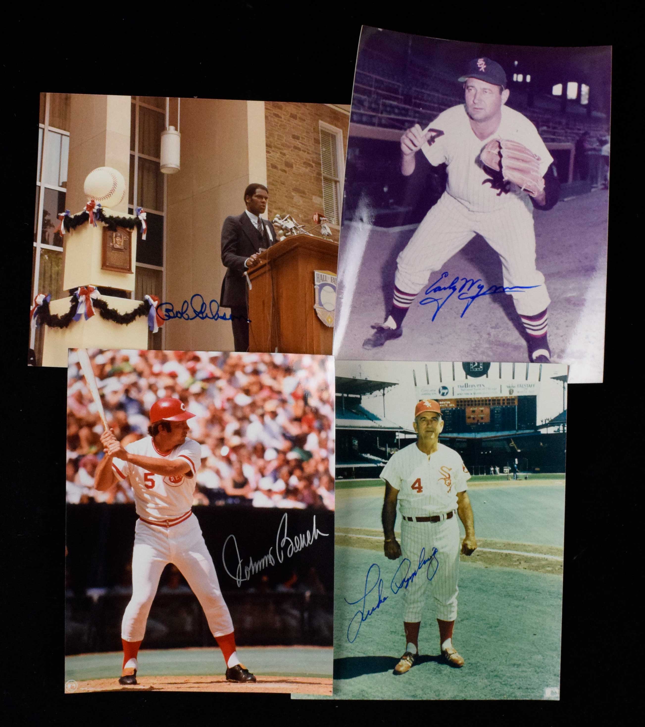 Description:Lot of (14) HOFer autographed 8"x10" photos, including Wynn, Gibson and Bench (Sigs. NM/MT-MT). Each is signed by a Hall of Famer on a color or B&W photo. Includes Luke Appling, Johnny Bench, Jim Bunning, Orlando Cepeda, Bobby Doerr, Don Drysdale, Bob Gibson, Billy Herman, Waite Hoyt, George Kell, Robin Roberts, Warren Spahn, Early Wynn and Hoyt Wilhelm/Peter Ueberroth. Signatures range from 8/9 out of 10 and photos range EX-NM.