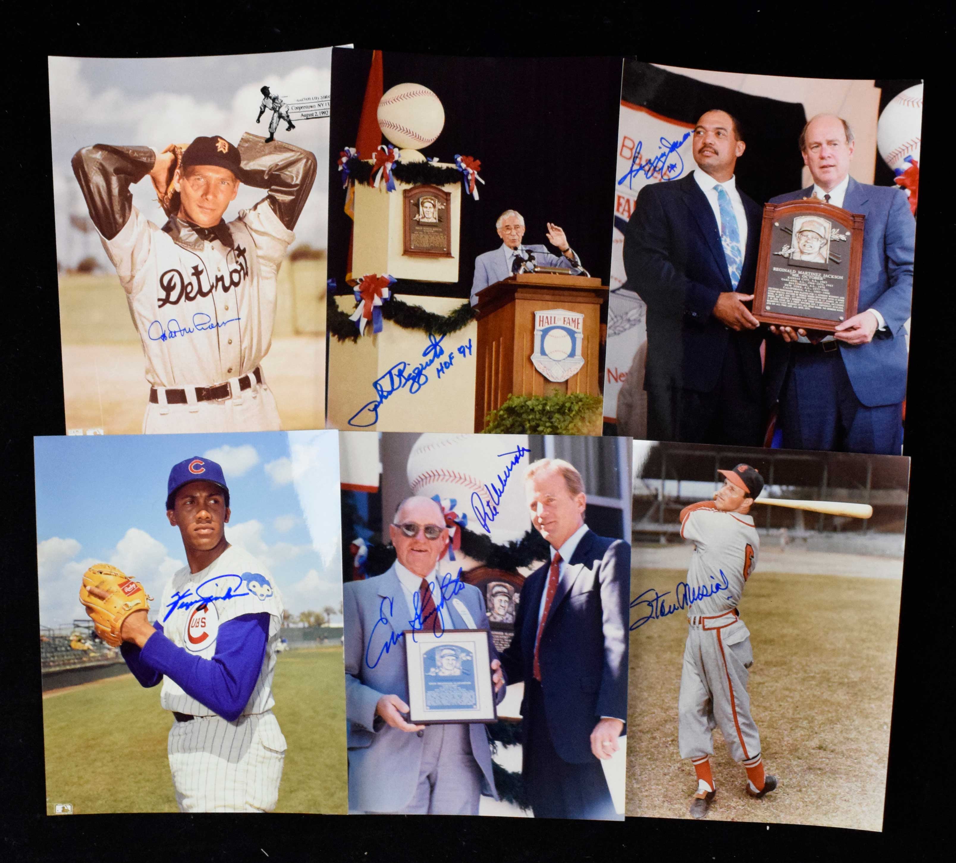 Description:Lot of (13) HOFer autographed 8"x10" photos, including Jackson, Newhouser and Musial (Sigs. EX/MT-MT). Each is signed by a Hall of Famer on a color or B&W photo. Includes Reggie Jackson, Fergie Jenkins, George Kell, Eddie Mathews, Johnny Mize, Stan Musial, Hal Newhouser, Jim Palmer, Gaylord Perry, Pee Wee Reese, Phil Rizzuto with "HOF 94" inscription, Brooks Robinson, and Enos Slaughter/Peter Ueberroth. Signatures range from 8/9 out of 10 and photos range EX-NM.
