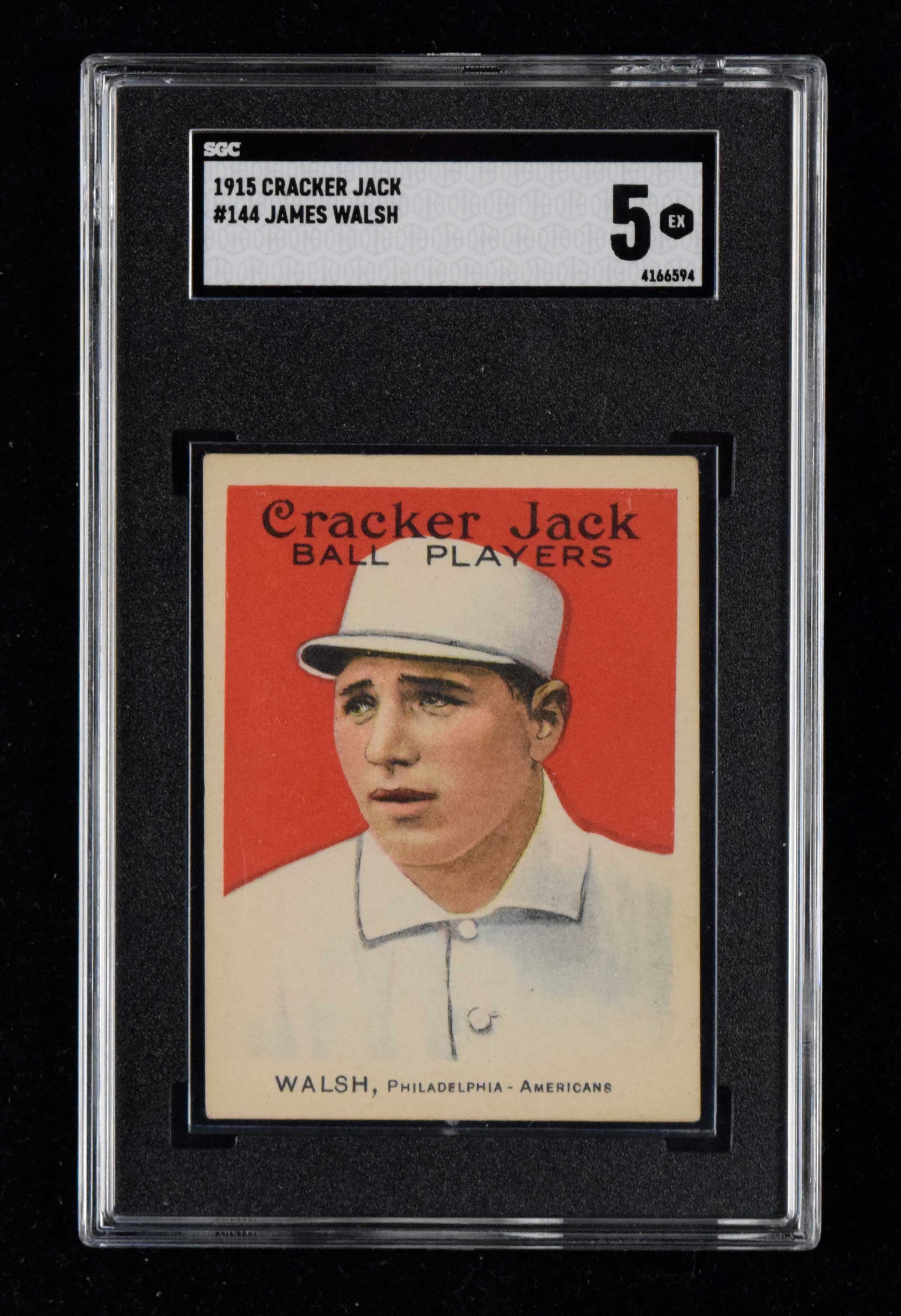 Description:1915 Cracker Jack #144 Jimmy Walsh (SGC 5 EX). Card retains outstanding eye appeal with a vibrant red background and light touches of wear to all four corners. Card also has some mild discoloration to the borders. Back is clean: SGC 5 EX.