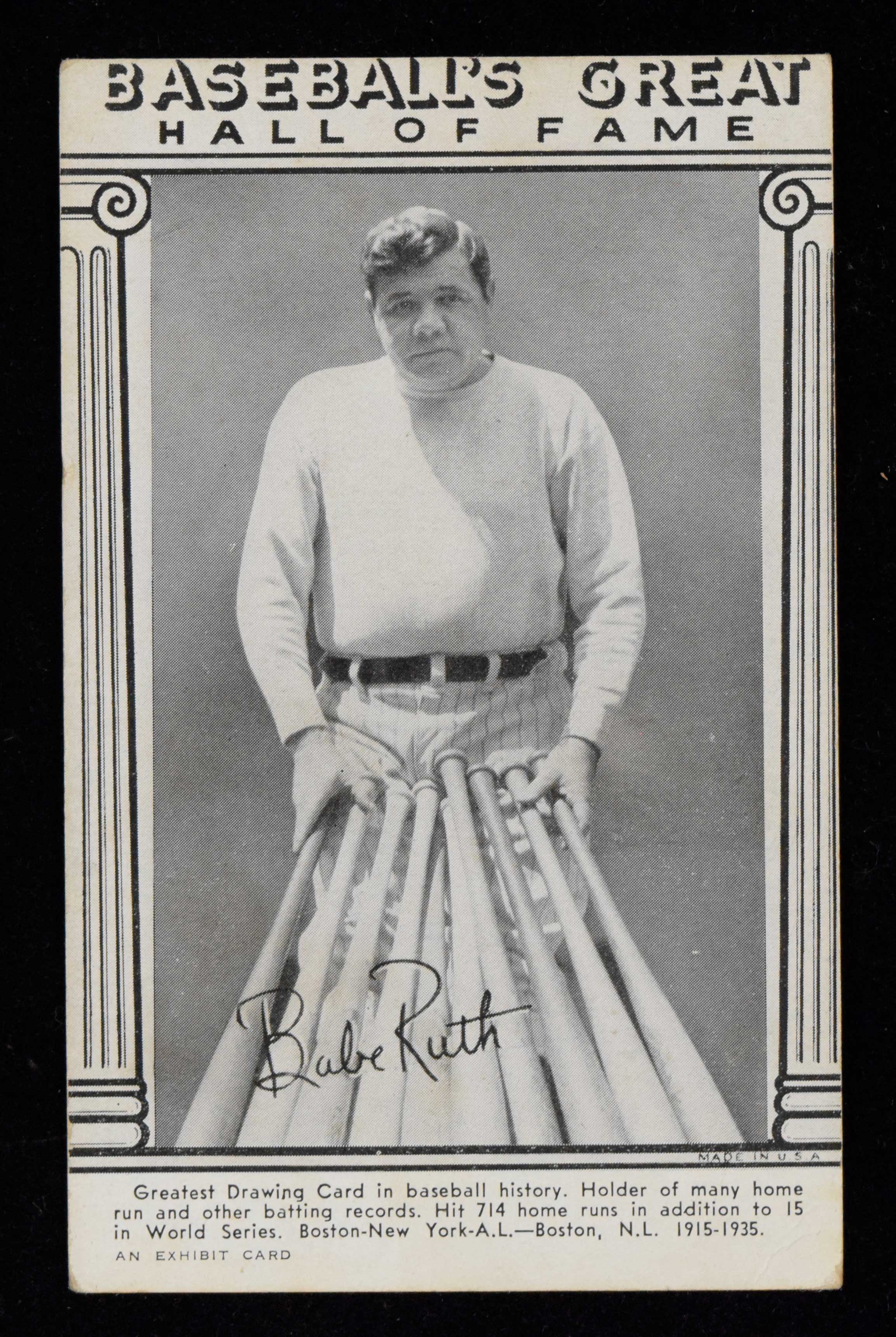 Description:1948 Exhibits Baseball's Great Hall of Fame Babe Ruth, Standing with Bats (GD). Outstanding original Ruth Exhibit card, Standing with Bats variation, is off-center top-to-bottom with a small corner crease in the lower right and moderate to heavy corner wear. Blank back has some light discoloration and a few small indents but is otherwise clean: GD.