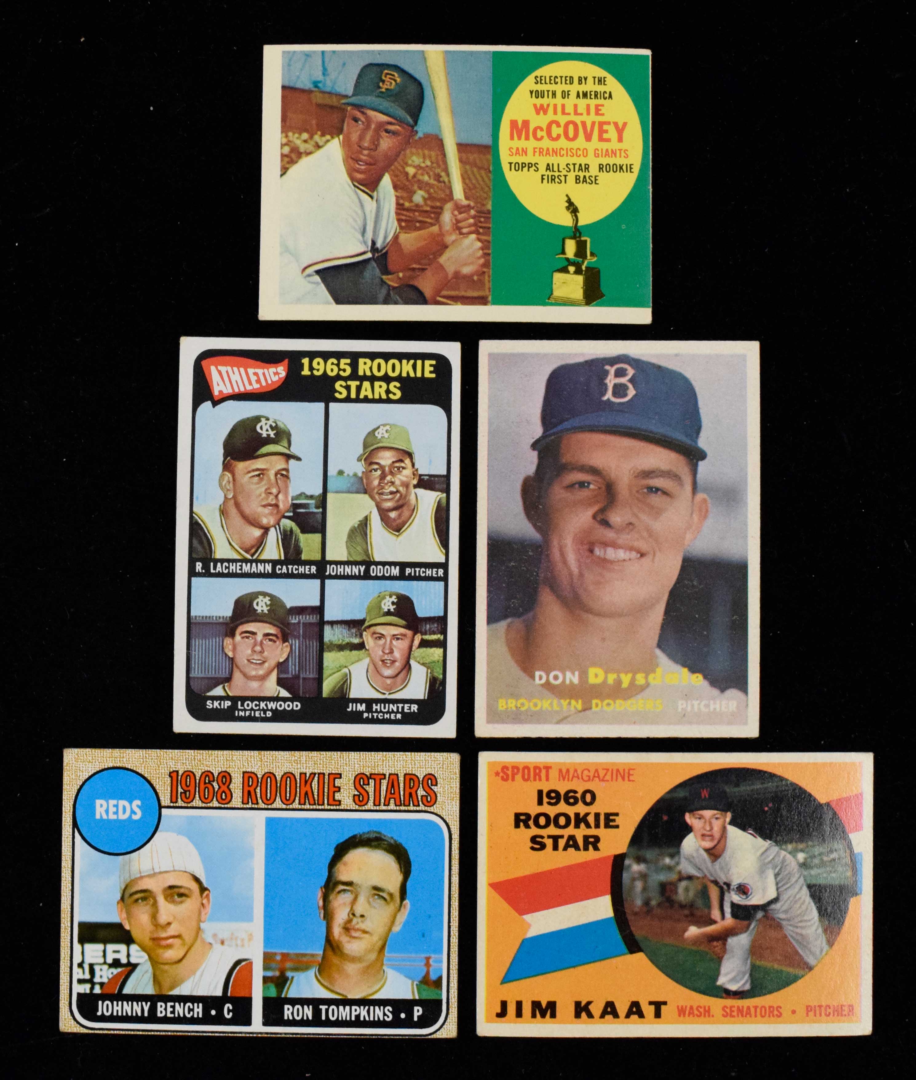 Lot of (5) 1950s-1960s Topps RCs, including Drysdale, Bench, and McCovey (GD-EX). Nice assortment of key 1950s-1960s Topps rookies, with 1957 Topps #18 Don Drysdale (EX), 1960 Topps #316 Willie McCovey (VG/EX; miscut); 1960 Topps #136 Jim Kaat (VG); 1965 Topps #526 Catfish Hunter RC (GD) and 1968 Topps #247 Johnny Bench (VG; miscut). Range: GD-EX.