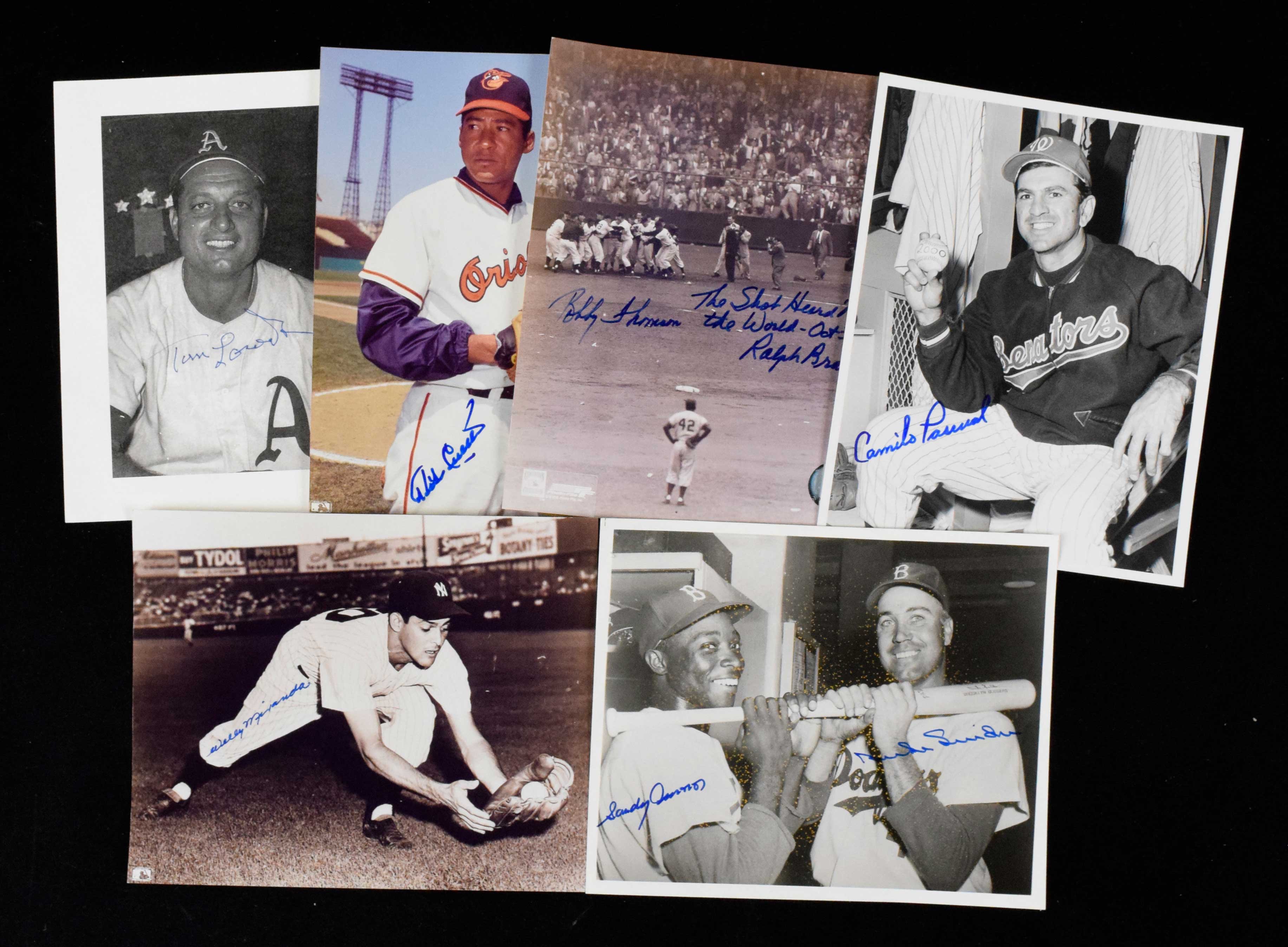 Description:Lot of approx (85) baseball autographs with heavy concentration of Cuban players (VG-NM/MT). Includes reproduction sheet of Comiskey Park blueprints signed by Minnie Minoso (tears); 7"x9.5" photo signed by Tom Lasorda; 15.5"x20" photo signed by Minnie Minoso (personalized); 3.5"x5.5" photo signed by Buck O'Neil (pers.); 8"x10" photo dual-signed by Duke Snider & Sandy Amoros (silvering); 8.5"x11" 1993 Upper Deck Baseball Heroes print multi-signed by Minnie Minoso, Orlando Cepeda, Tony Perez, Luis Tiant; 2009 Joe DiMaggio Memorial Classic program signed by (25): Brooks Robinson, Minnie Minoso, Tony Taylor, Paul Blair, Rico Carty, Bert Campaneris, John Blanchard, Toy Gonzalez, Al Downing, Amos Otis, Stan Bahnsen, Blue Moon Odom, Tommy Davis, Wayne Garrett, Oil Can Boyd, Paul Casanova, others; 8"x10" photo dual-signed by Bobby Thomson & Ralph Branca; 1991 "The Giants Win The Pennant!" book signed by Bobby Thomson (pers.). Remainder are a mix of signed photos, index cards, and other flats: Whitey Ford (pers.), Buck O'Neil, Mike Cuellar, Camilo Pascual, Orlando Hernandez, Bert Campaneris, Don Lenhardt, Bert Haas, Mike de la Hoz, Andres Fleitas, Willy Miranda, Tito Fuentes, Spook Jacobs, Paul Casanova (pers.), Pat McGlothin, Fermin Guerra, Sam Chapman, Gonzalo Naranjo, Severino Mendez, Carden Gillenwater, Ross Grimsley, Red Hayworth, Ellis Clary, Steve Souchock, Howie Moss, Mal Mallette, Dino Restelli, Rigoberto Castillo, Connie Marrero, Clarence Beers, Pedro Ramos, Rogelio Alvarez, Adrian Zabala, Sandy Consuegra, Steve Rachunok, Ed Mierkowicz, others. Sigs rate 4 to 10 (avg 8) out of 10: VG-NM/MT