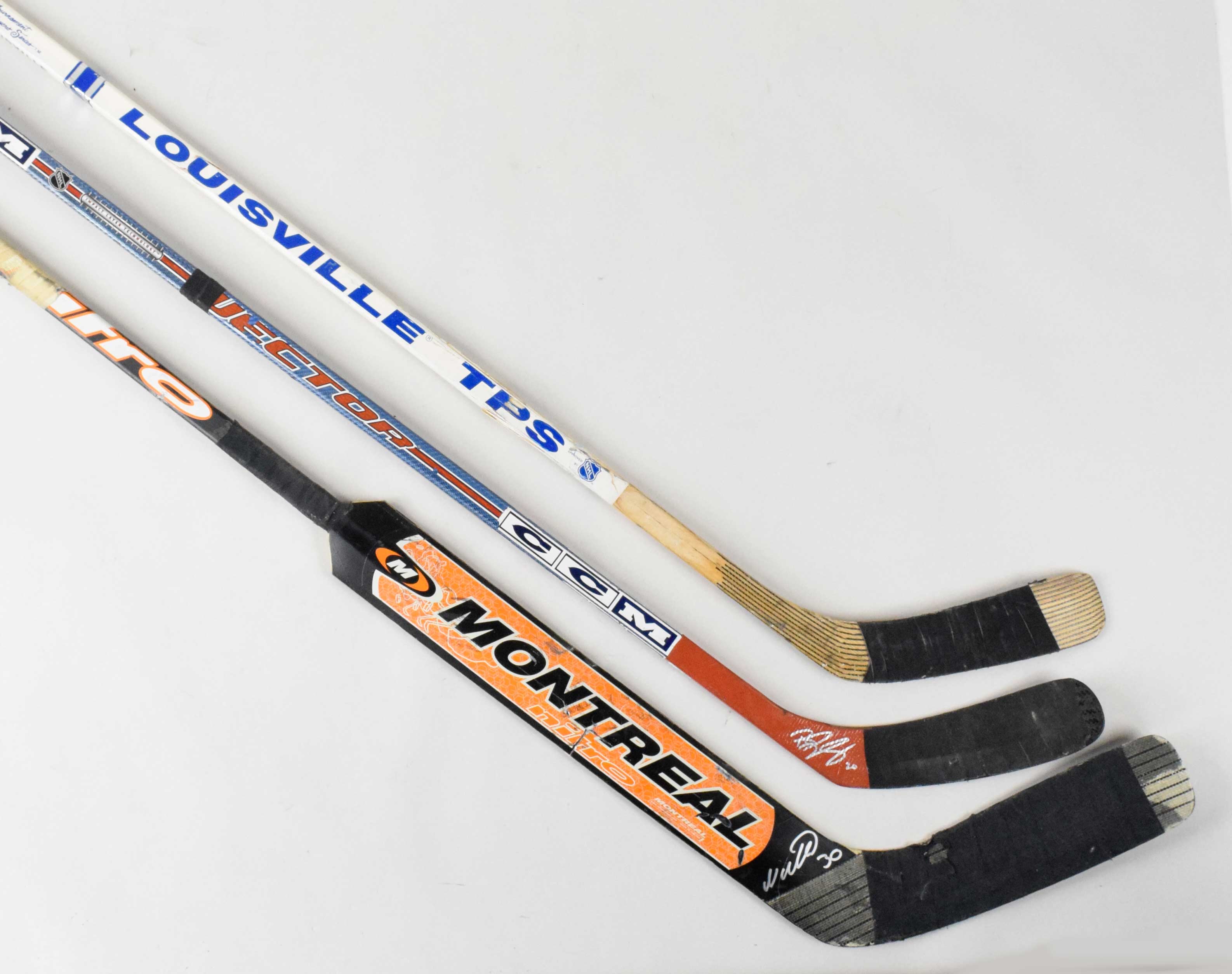 Description:Pat LaFontaine, R.J. Umberger (signed), and Antero Niittymaki (signed) professional model hockey sticks (VG-EX). Includes c.late 1980s Louisville TPS Pat LaFontaine model stick (VG cracked with excellent use), c.mid-late 2000s Montreal "Nitro" Antero Niittymaki model goalie stick signed by Niittymaki in silver marker rating 8/9 out of 10 (EX nice use), and c.mid 2010s CCM Vector OPS-V120 R.J. Umberger model stick signed by Umberger in silver marker rating 7/8 out of 10 (EX nice use).