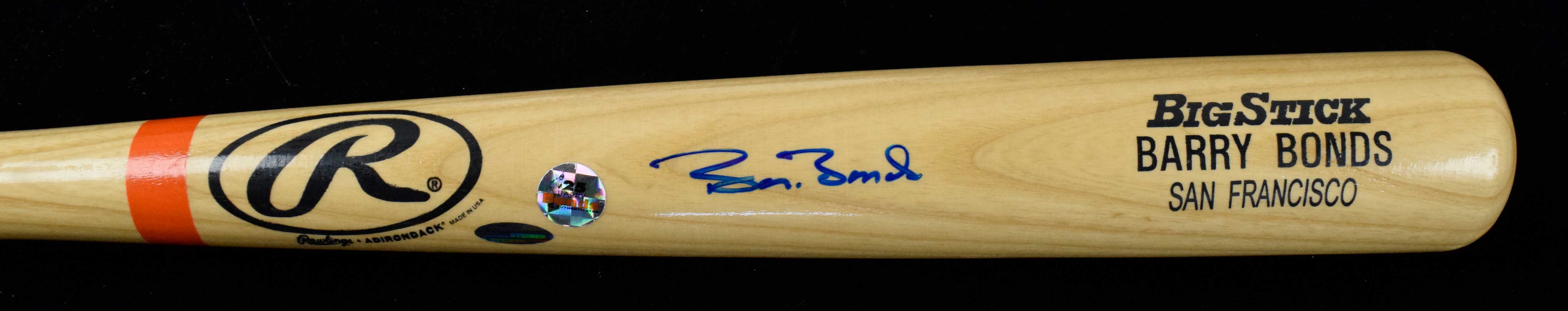 Description:Barry Bonds signed baseball bat - Steiner & Bonds Authenticated (NM). 34" Rawlings-Adirondack Barry Bonds model bat signed by Bonds in blue marker. Signature rates 8/9 out of 10. Includes COA from Steiner, along with Barry Bonds and Steiner hologram stickers on the bat: NM