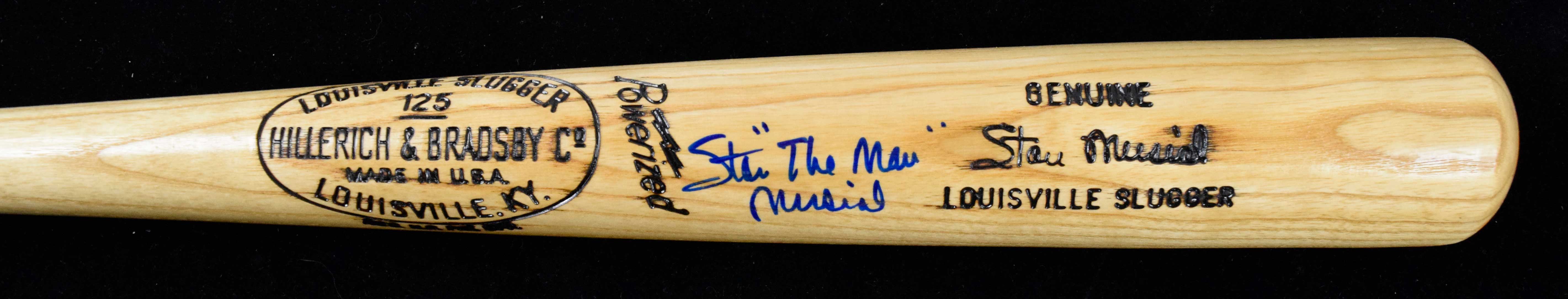 Description:Stan "The Man" Musial signed replica model baseball bat (NM). 34.5" Louisville Slugger M159 Stan Musial show model bat signed by Musial in blue marker with "The Man" nickname. Signature rates 9 out of 10: NM