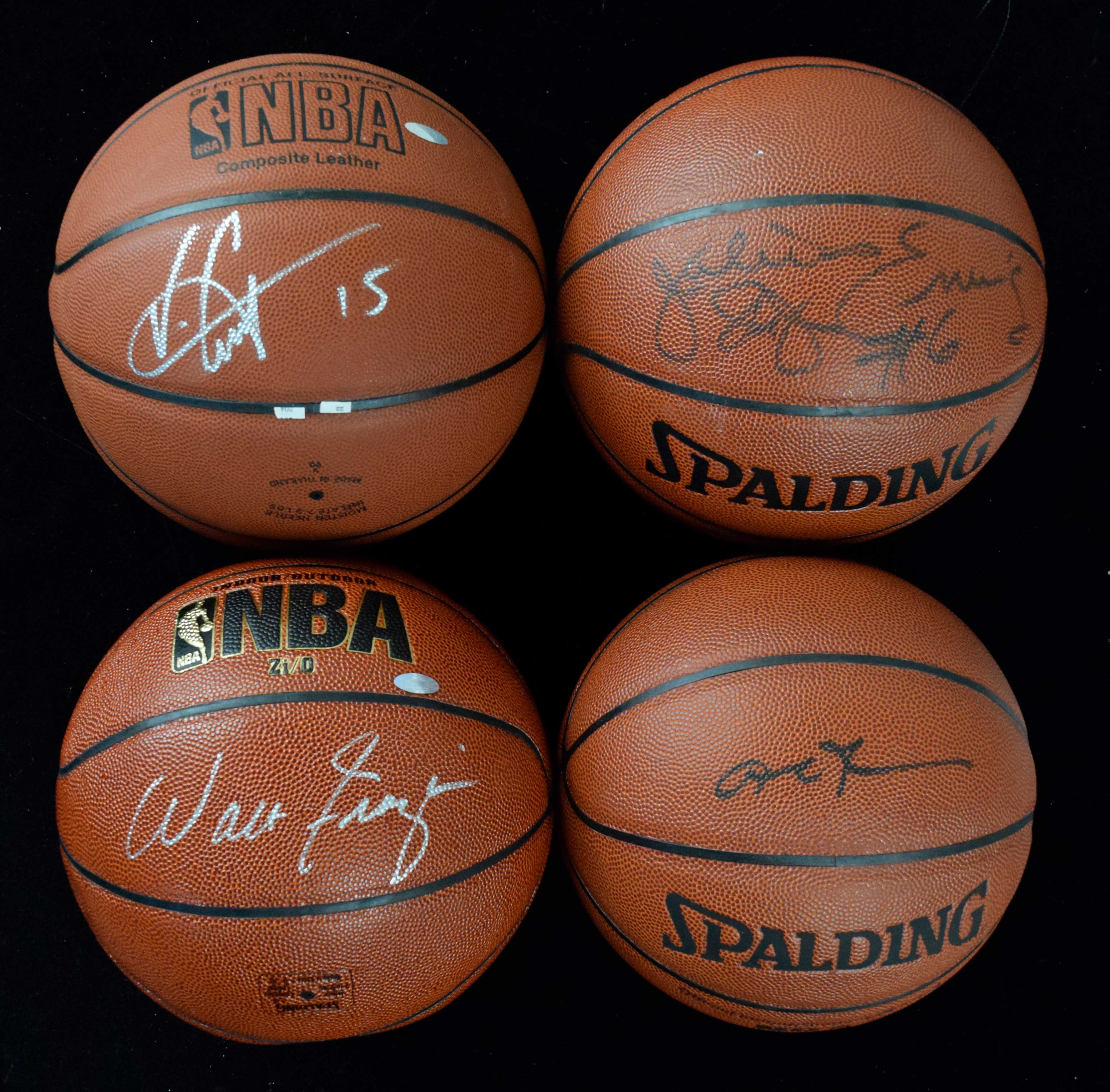 Description:Julius Erving, Walt Frazier, Allen Iverson, Vince Carter signed basketballs (EX-NM/MT). Includes a Spalding NBA indoor/outdoor ball signed by Julius "Dr. J" Erving (EX-EX/MT minor surface wear), Spalding NBA indoor/outdoor ball signed by Walt Frazier (Steiner), Spalding NBA indoor/outdoor ball signed by Allen Iverson, and Spalding NBA all-surface ball signed by Vince Carter (Steiner). Signatures rate 7/8 to 9/10 out of 10: EX-NM/MT