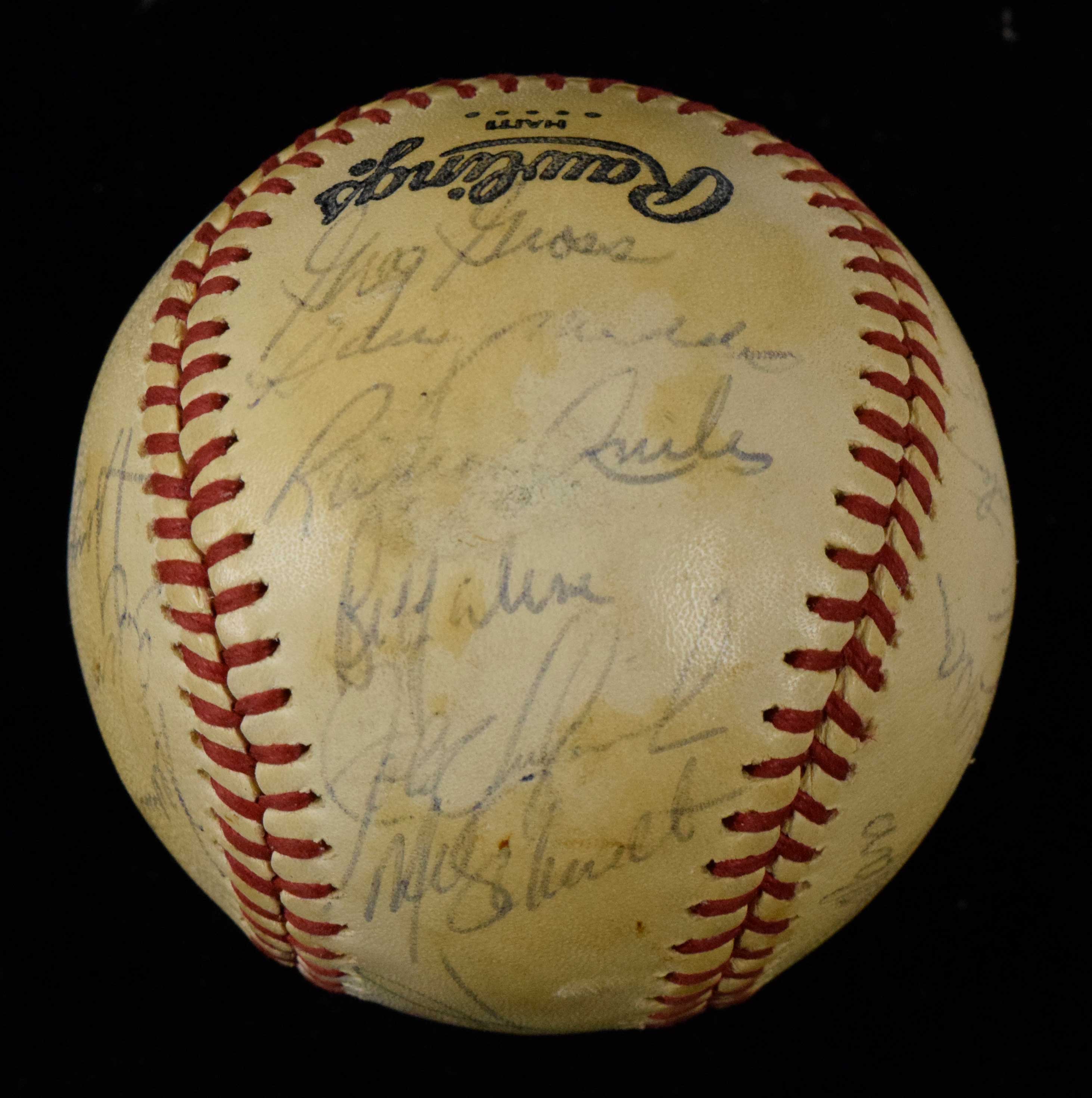 Description:1980 World Series champion Philadelphia Phillies team signed baseball with Espinosa (VG). C.Feeney NL ball signed by (28) including Dallas Green, Mike Schmidt, Pete Rose, Nino Espinosa, Larry Bowa, Bob Boone, Greg Luzinski, Garry Maddox, Manny Trillo, Bake McBride, Dick Ruthven, Larry Christenson, Del Unser, Greg Gross, Ron Reed, and others. Signatures rate 5/6 to 8/9 (avg 7) out of 10. Areas of toning on each panel: VG