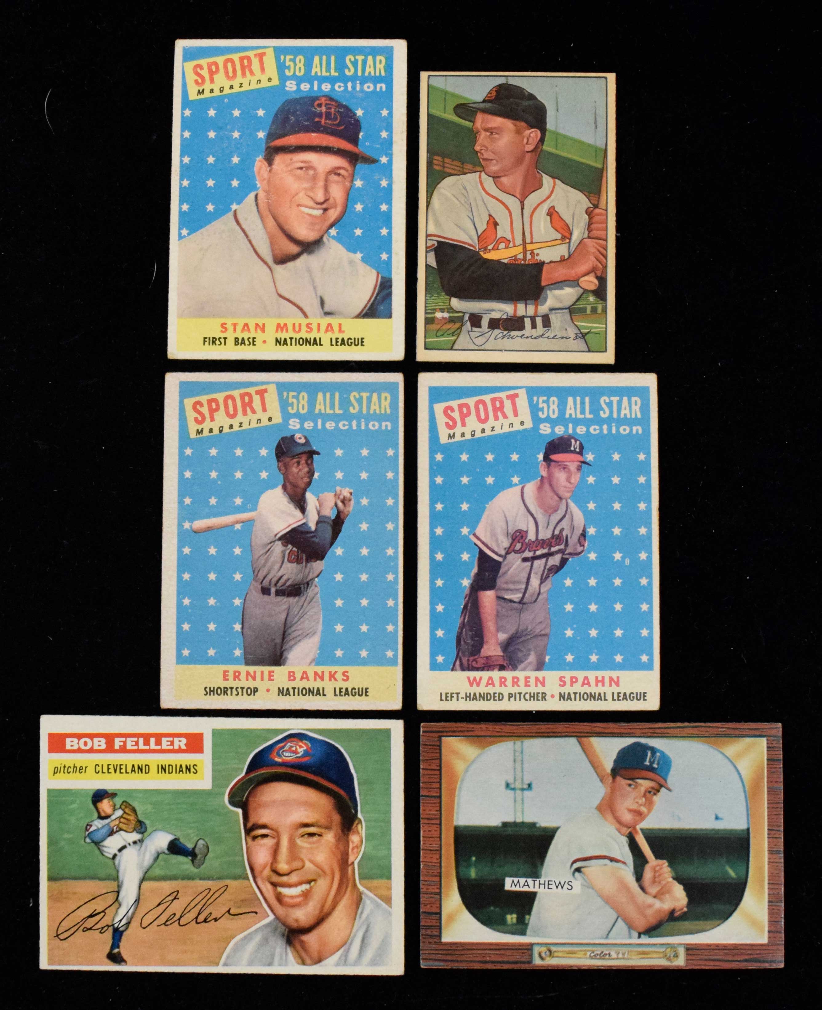 Description:Lot of (13) stars and HOFers baseball cards from 1952-1958 (GD-EX). Includes 1952 Bowman #30 Red Schoendienst; 1955 Bowman #103 Eddie Mathews; 1956 Topps #s 200 Bob Feller, 226 New York Giants team, and 251 New York Yankees team; 1958 Topps #s 2 Bob Lemon, 476 Stan Musial, 479 Nellie Fox, 482 Ernie Banks, 483 Luis Aparicio, 484 Frank Robinson, 495 Herb Score, and 494 Warren Spahn. Most appear to average VG overall. Range: GD-EX