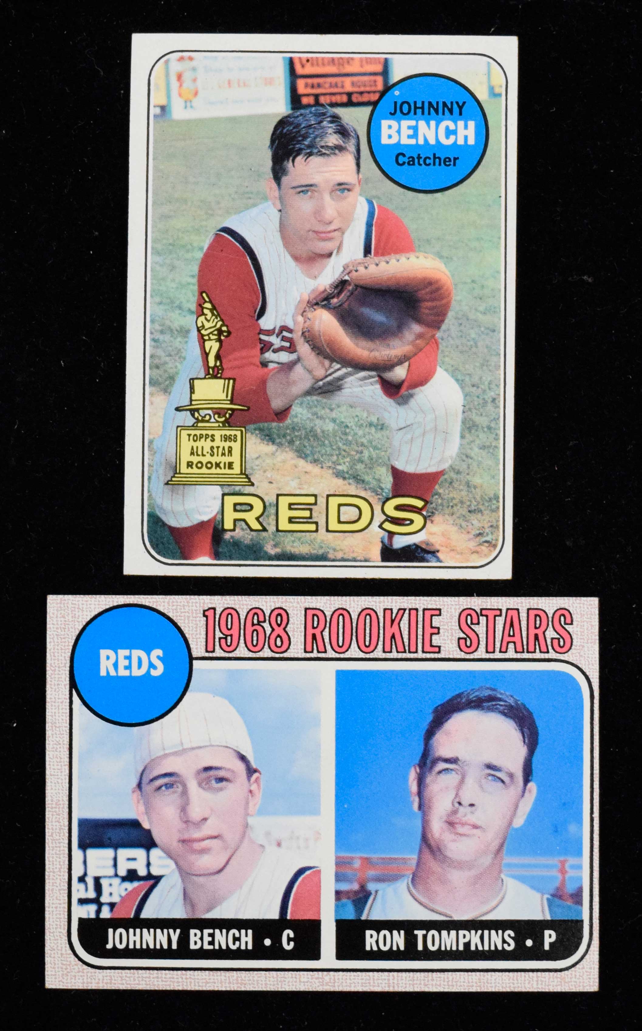 Johnny Bench 1968 rookie and 1969 Topps Baseball cards (VG/EX-EX oc). Includes 1968 Topps #247 Bench rookie (VG/EX faded and off center), 1969 Topps #95 Bench (EX oc).