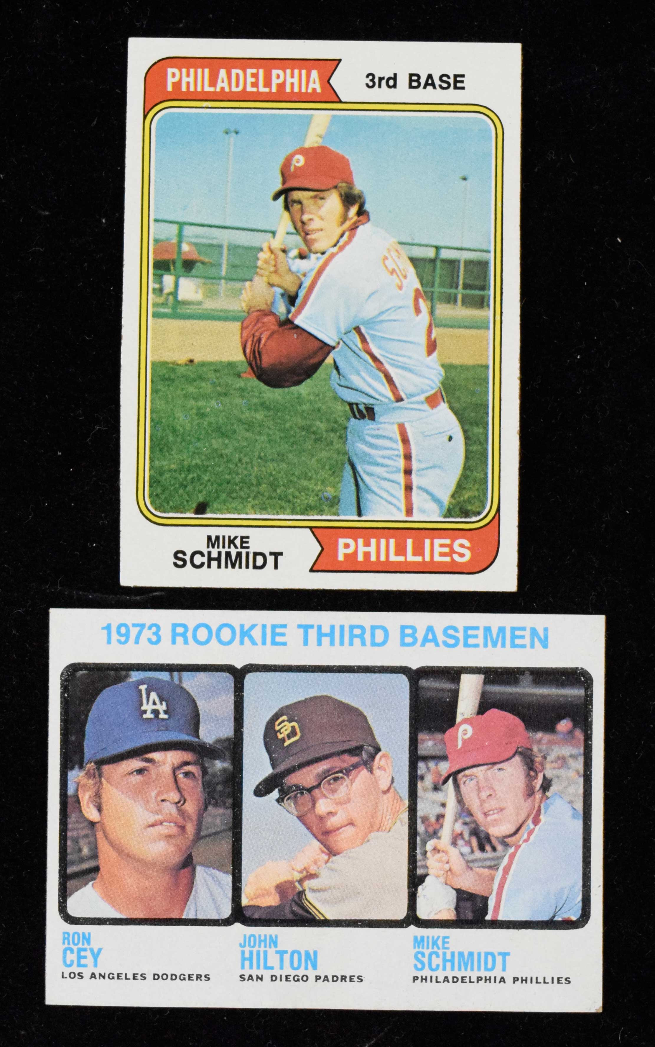 Mike Schmidt 1973 rookie and 1974 Topps Baseball cards (VG/EX-EX/MT). Includes 1973 Topps #615 Schmidt rookie (VG/EX wear at one corner), and 1974 Topps #283 Schmidt (EX-EX/MT).