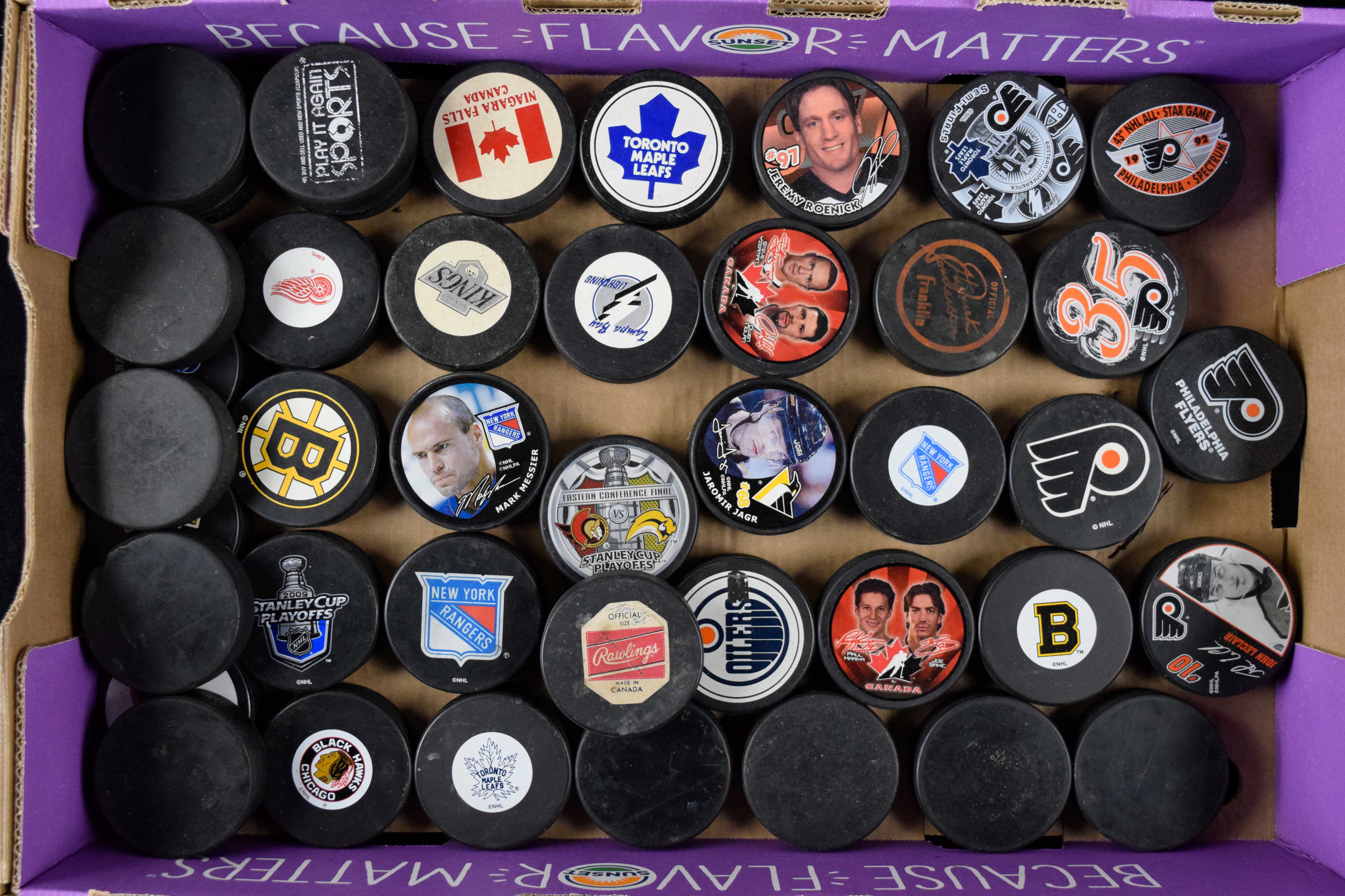 Description:Lot of (42) hockey pucks (VG-NM). Mix of blank pucks, photo pucks, team pucks, and a few official game pucks. Various conditions throughout the lot. Most appear to average EX-EX/MT overall. Range: VG-NM