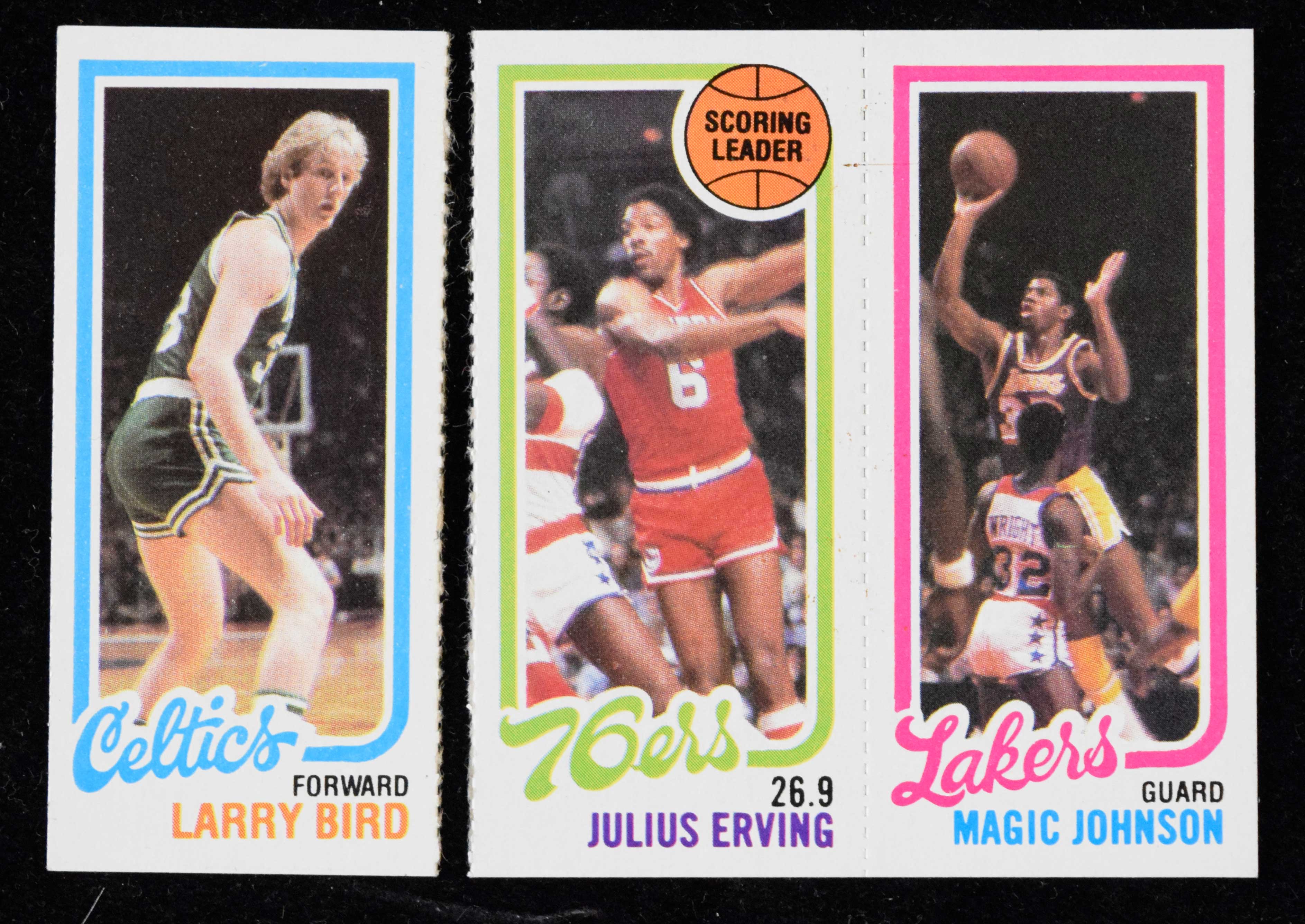 Description:1980-81 Topps #34/139/174 Julius Erving / Larry Bird / Magic johnson rookie card (see description). #34 Bird rookie is perforated from the other two, and grades EX. The attached Erving and Johnson cards grade EX/MT-NM.