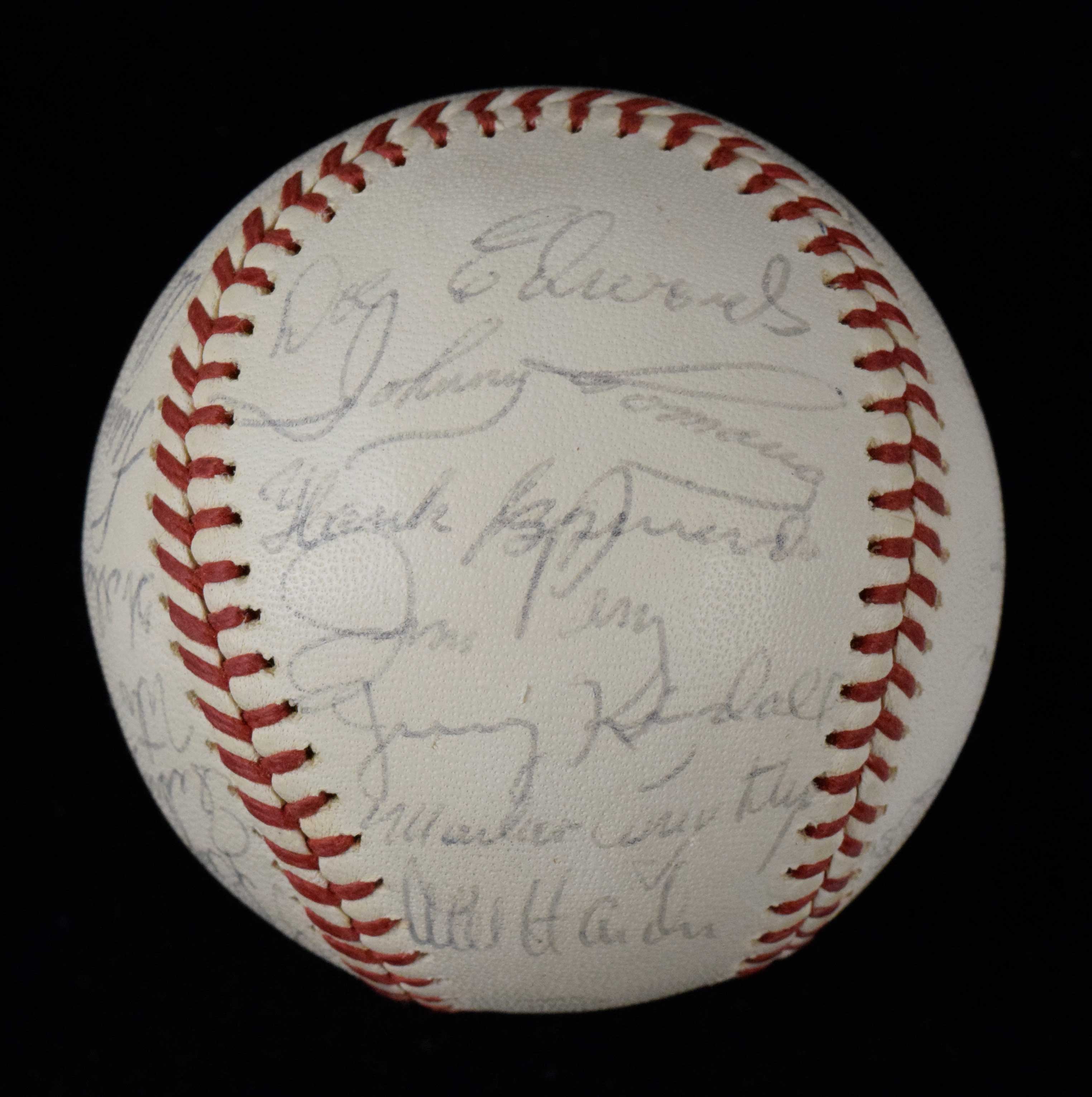 Description:1962 Cleveland Indians team signed baseball (NM). J.Cronin AL ball signed by (28) members of the 1962 Indians including Mel McGaha, Jim Perry, Johnny Romano, Dick Donovan, Woodie Held, Chuck Essegian, Al Luplow, Tito Francona, Jerry Kindall, Jim Grant, Doc Edwards, Pedro Ramos, Bubba Phillips, Willie Kirkland, Ty Cline, and others (Frisch is clubhouse signed). Signatures rate 4 to 8/9 (avg 7) out of 10: NM