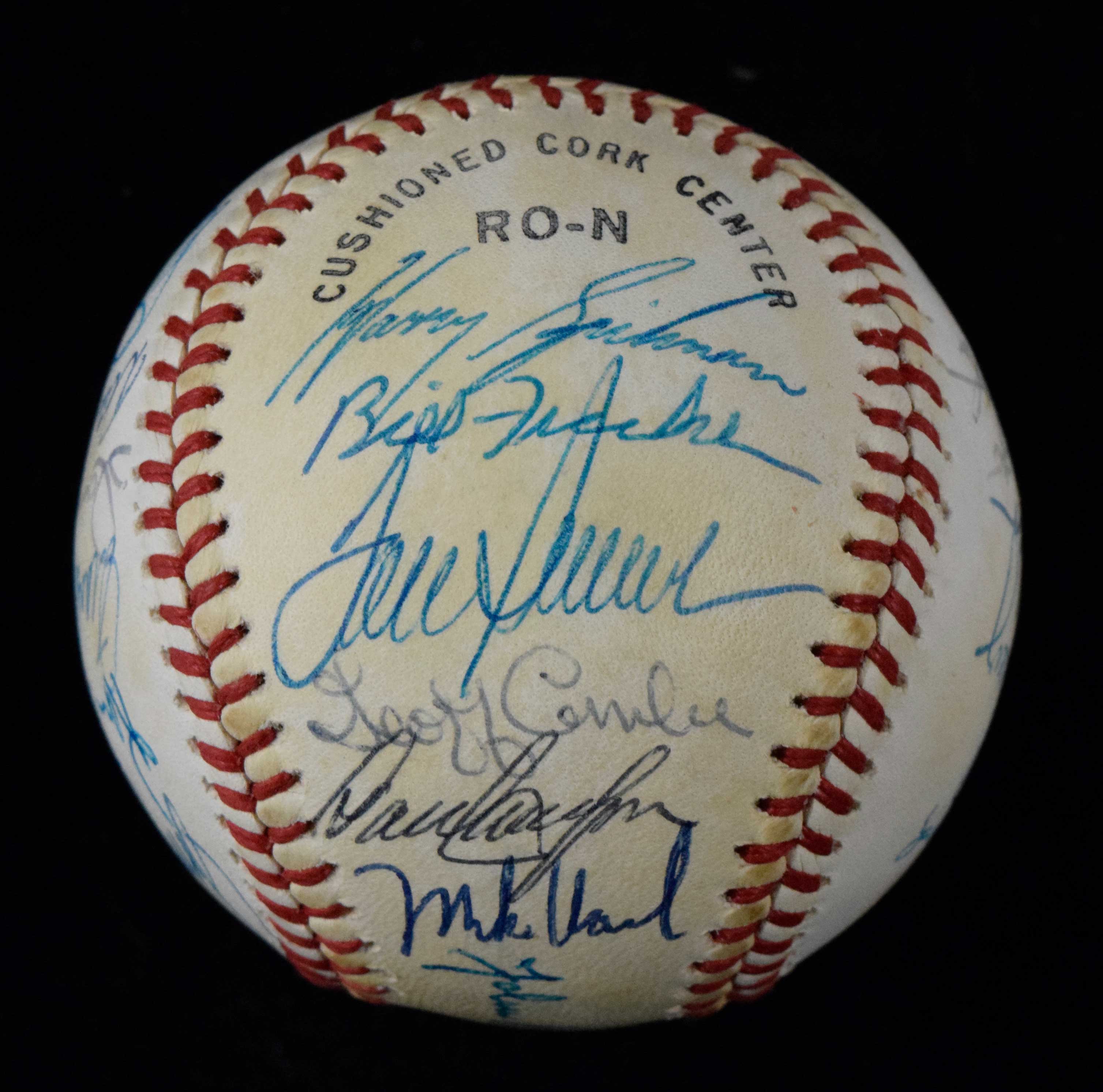 Description:1981 Cincinnati Reds team signed baseball - JSA (EX). C.Feeney NL ball signed by (28) members of the 1981 Reds including John McNamara, Russ Nixon, Tom Seaver, Johnny Bench, Dave Concepcion, George Foster, Ray Knight, Ron Oester, Ken Griffey, Mario Soto, Bruce Berenyi, Joe Nolan, Joe Price, Dan Driessen, and others. Signatures rate 5/6 to 9 (avg 8) out of 10. Includes full LOA from JSA. Areas of light to moderate toning on each panel: EX